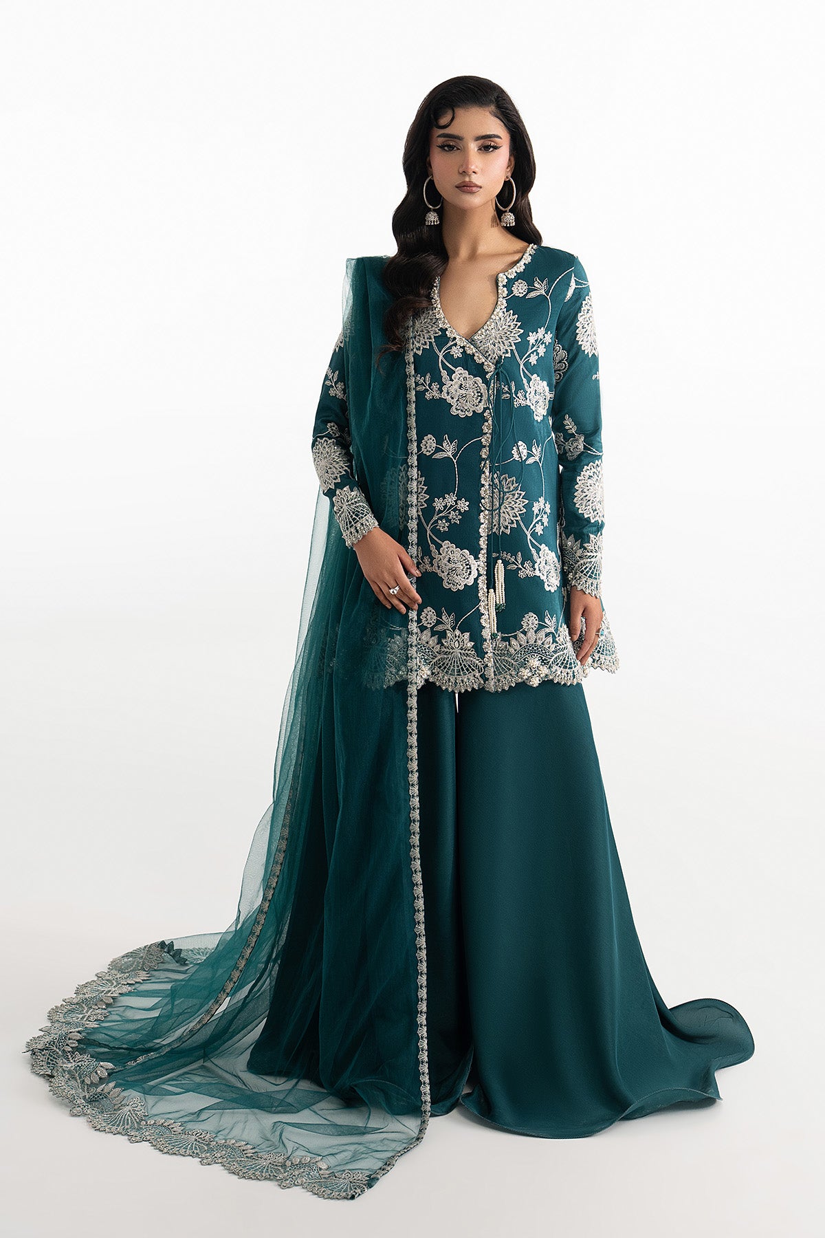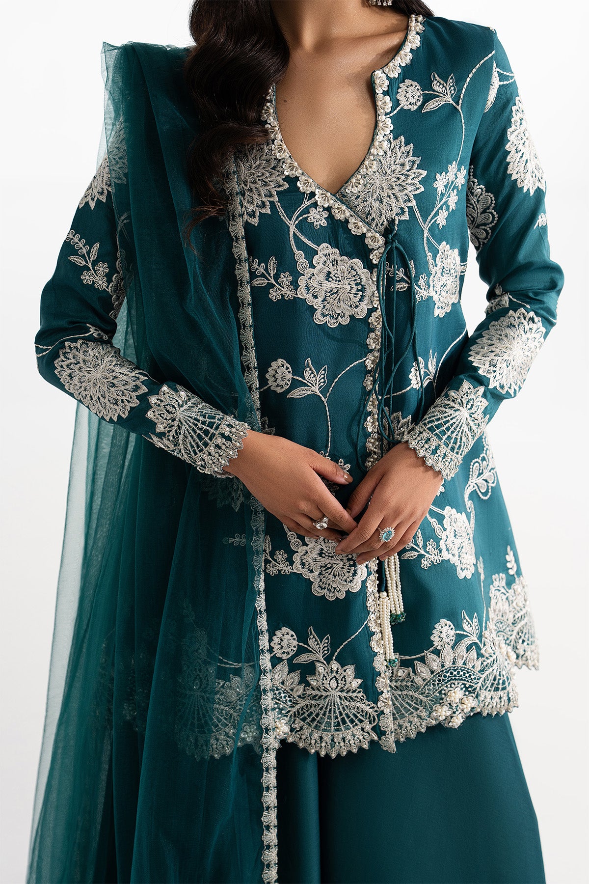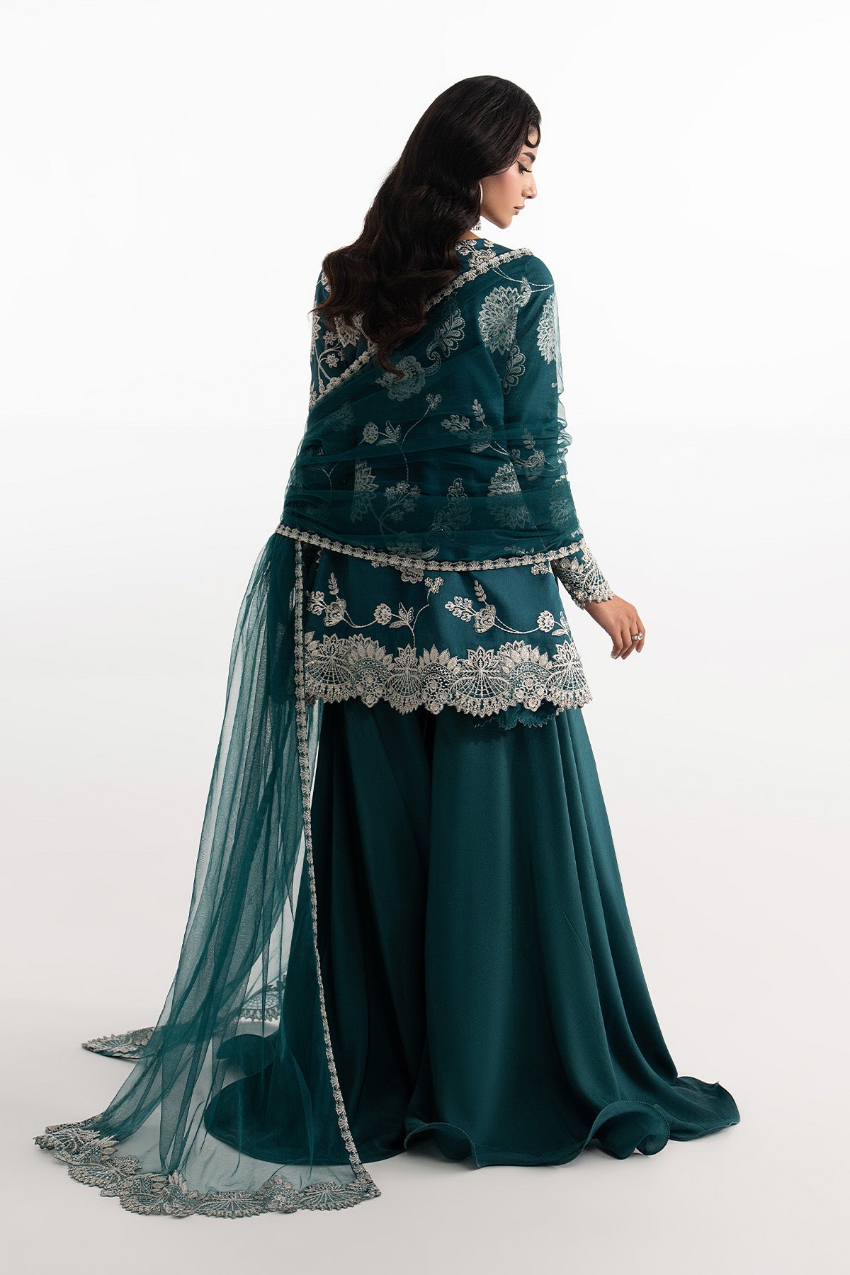 Celebrate Eid in style with this chic peplum shirt, adorned with intricate embroidery on the front, back, and sleeves for a timeless festive appeal. Paired with a net dupatta and flared medium silk palazzo pants, the ensemble combines modern silhouettes with traditional craftsmanship, creating a graceful and elegant look for the occasion.