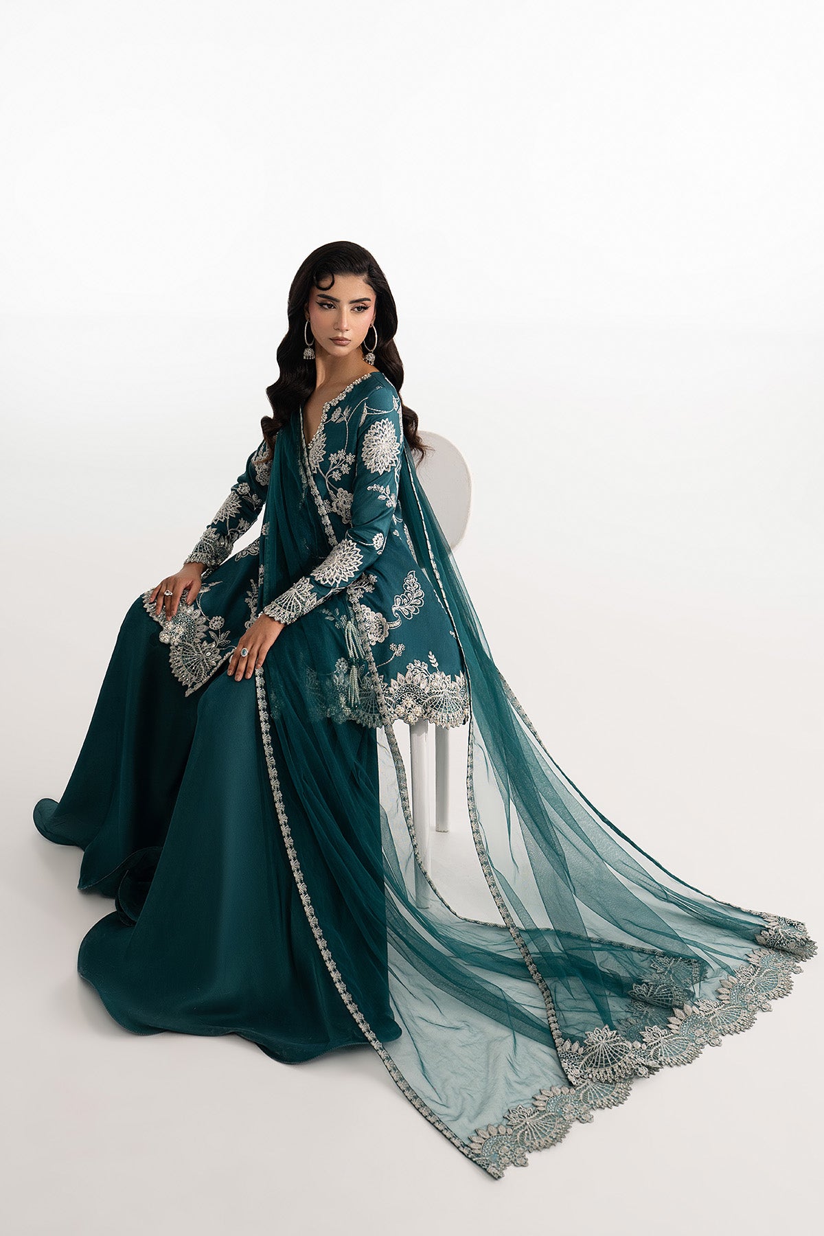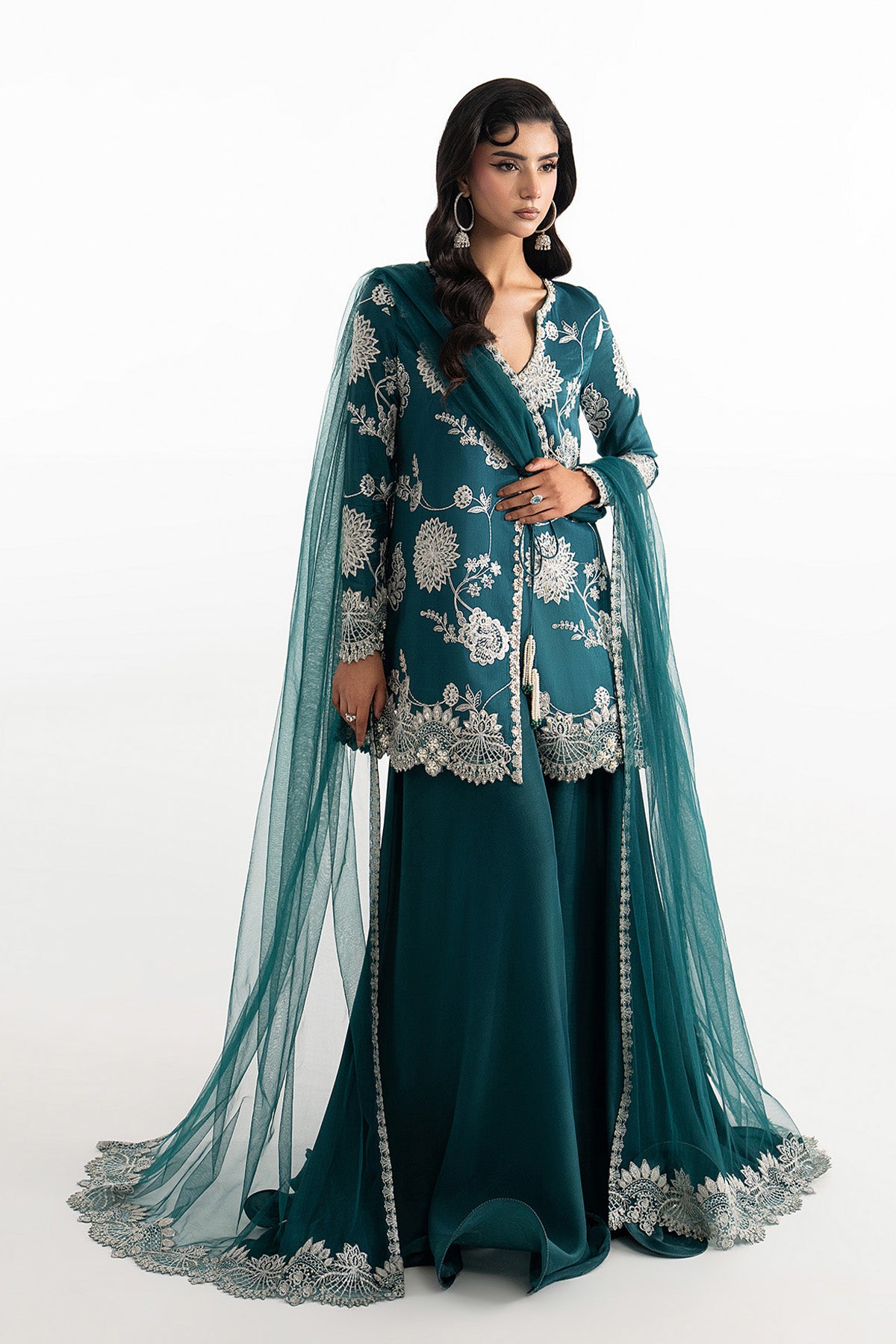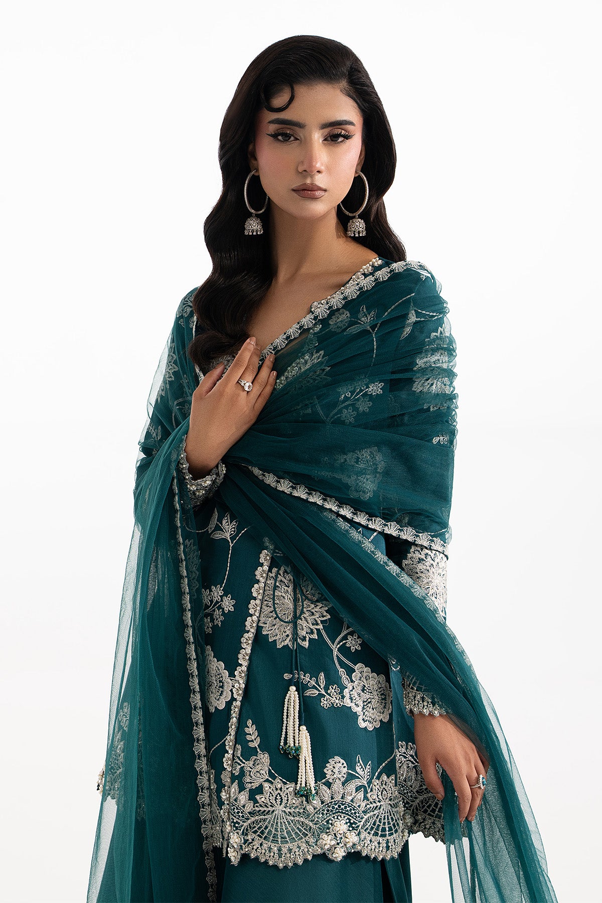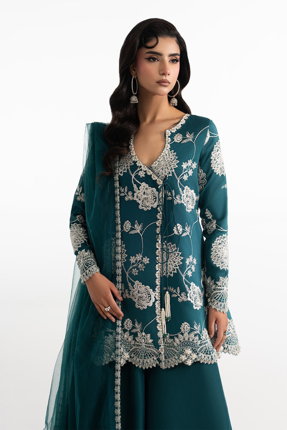Celebrate Eid in style with this chic peplum shirt, adorned with intricate embroidery on the front, back, and sleeves for a timeless festive appeal. Paired with a net dupatta and flared medium silk palazzo pants, the ensemble combines modern silhouettes with traditional craftsmanship, creating a graceful and elegant look for the occasion.
