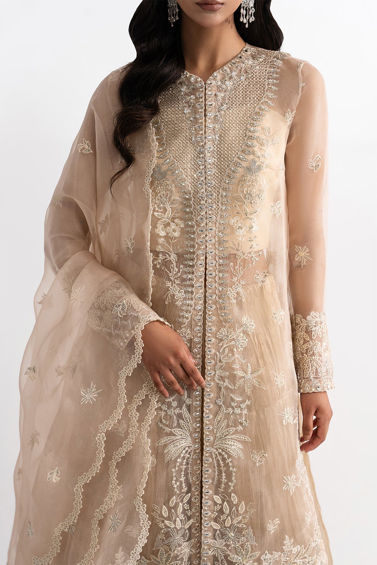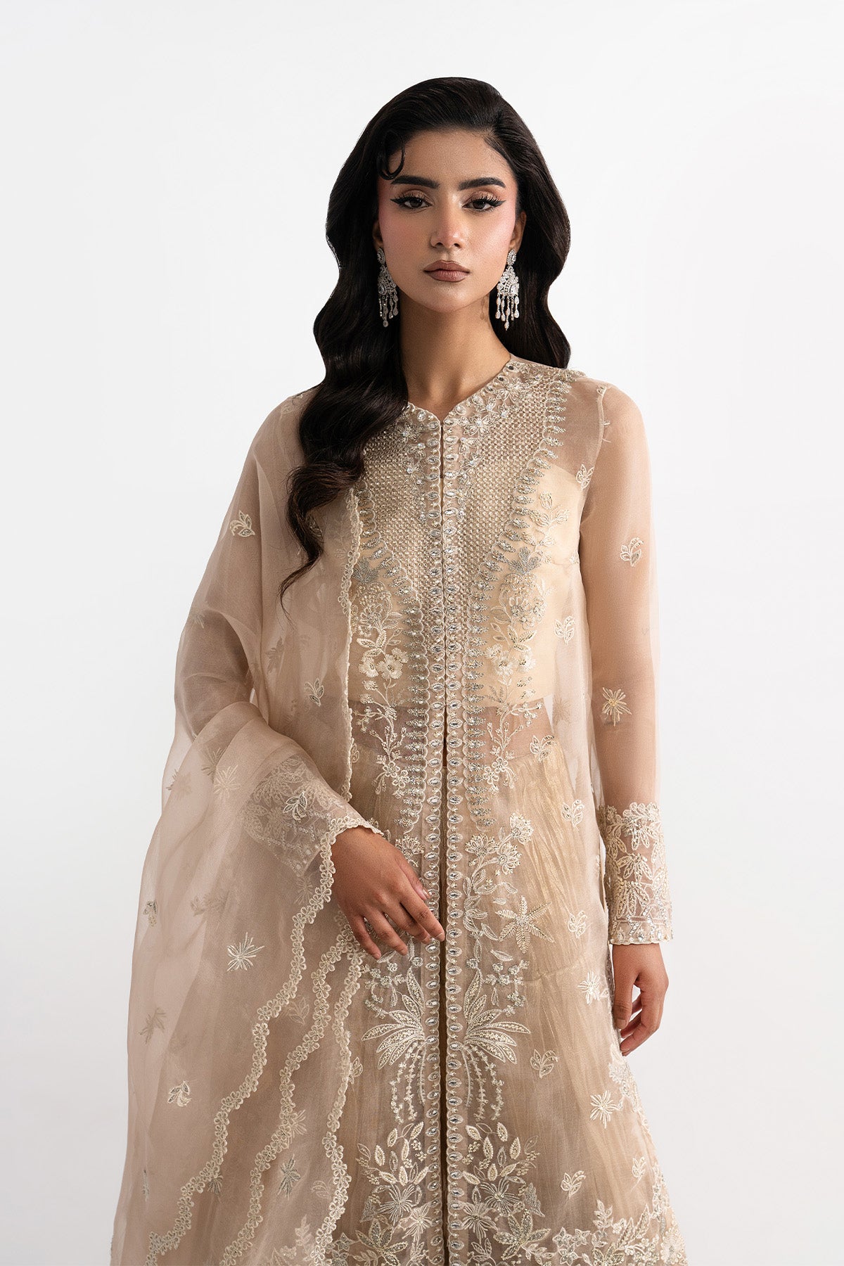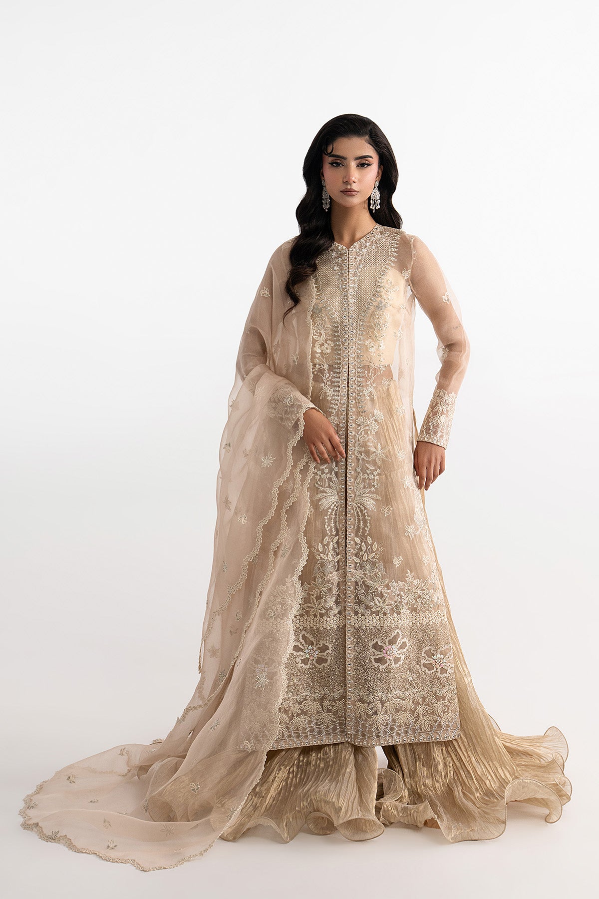 Elevate your Eid celebrations with a long open organza shirt, fully embroidered on the front, sleeves, and back. The intricate handwork is enhanced with delicate detailing, adding depth and festive elegance to the ensemble. Styled with pleated flared pants in luxurious Masuri fabric and paired with an organza dupatta featuring a scalloped embroidered border, this outfit exudes effortless charm and sophistication, perfect for making a statement this Eid.