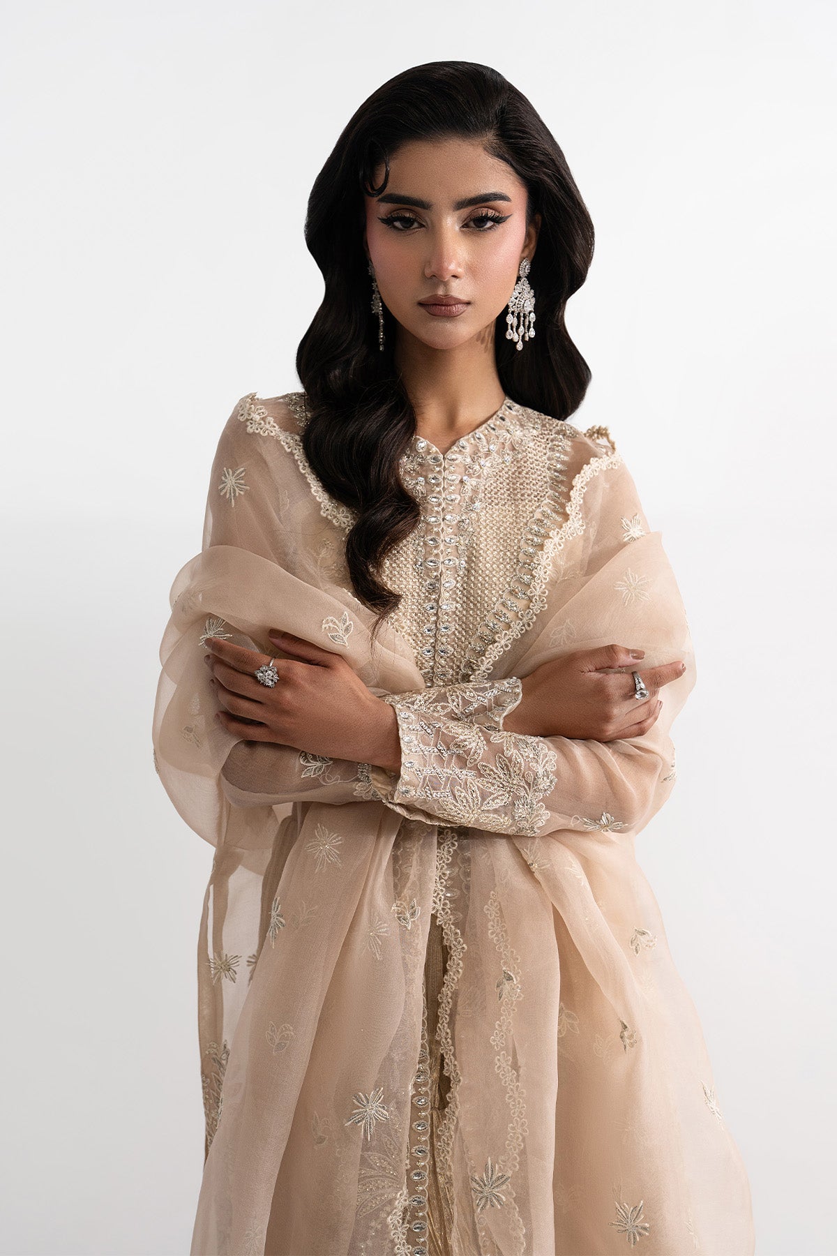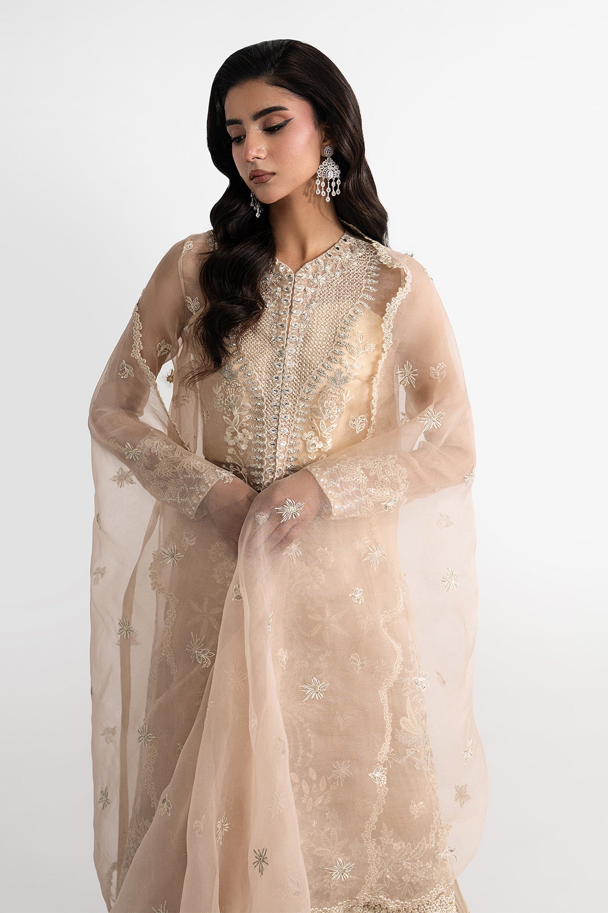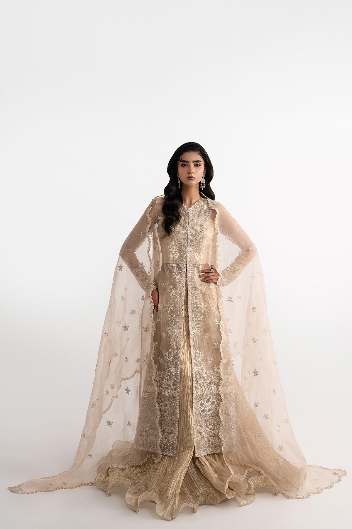 Elevate your Eid celebrations with a long open organza shirt, fully embroidered on the front, sleeves, and back. The intricate handwork is enhanced with delicate detailing, adding depth and festive elegance to the ensemble. Styled with pleated flared pants in luxurious Masuri fabric and paired with an organza dupatta featuring a scalloped embroidered border, this outfit exudes effortless charm and sophistication, perfect for making a statement this Eid.