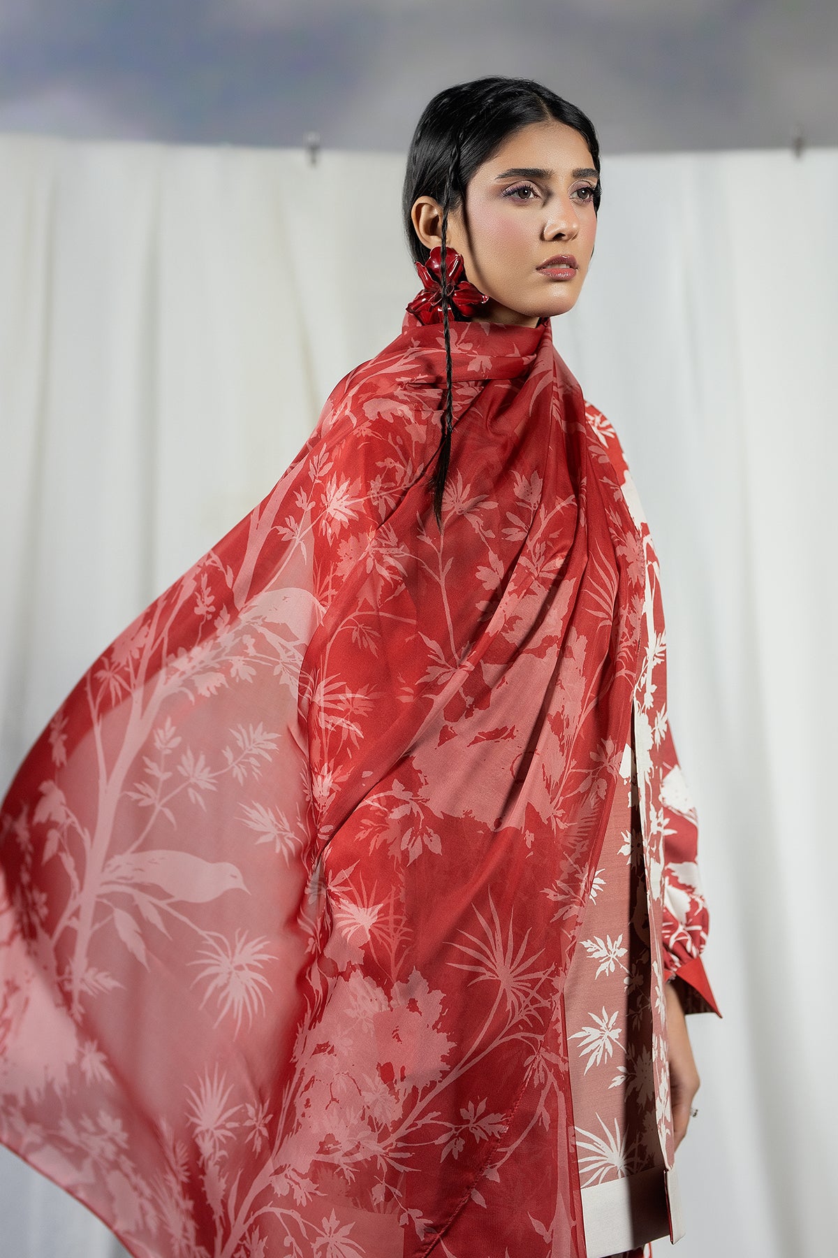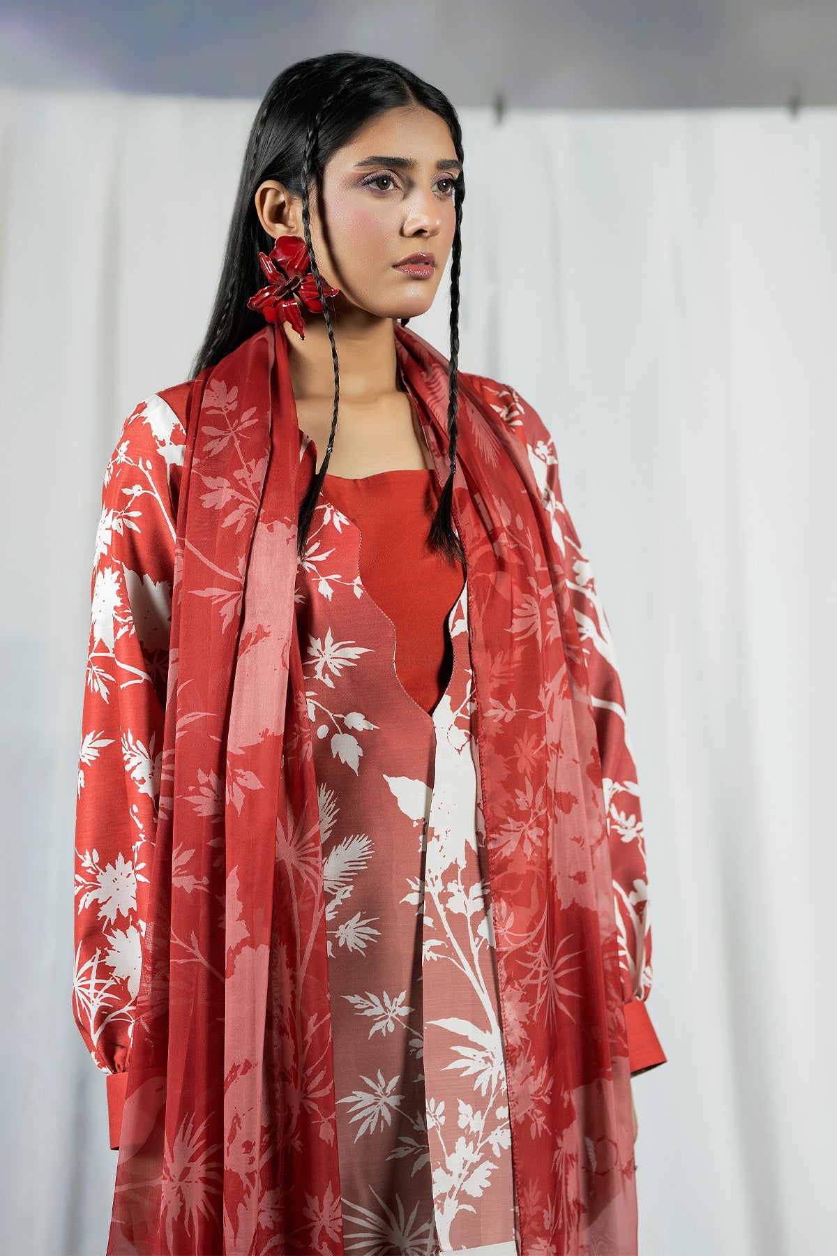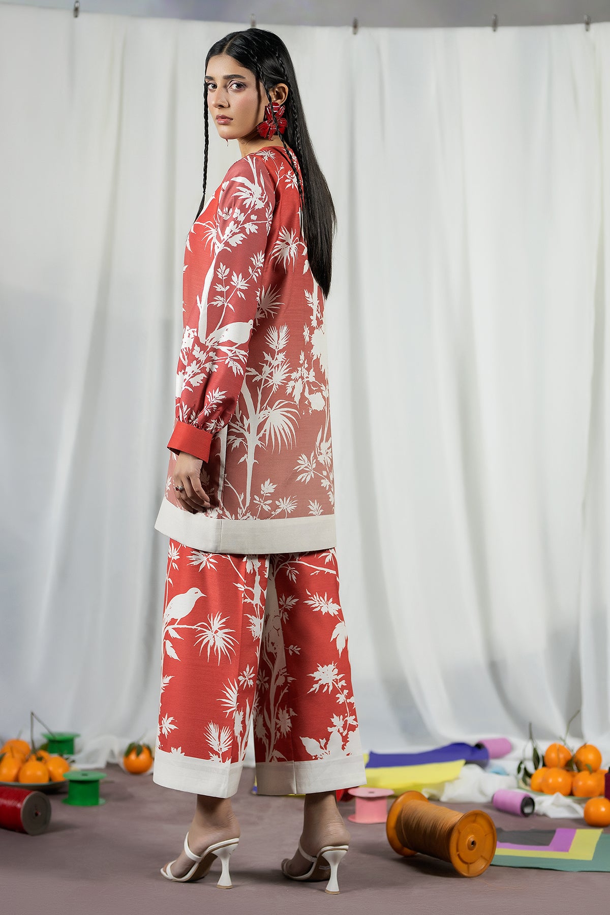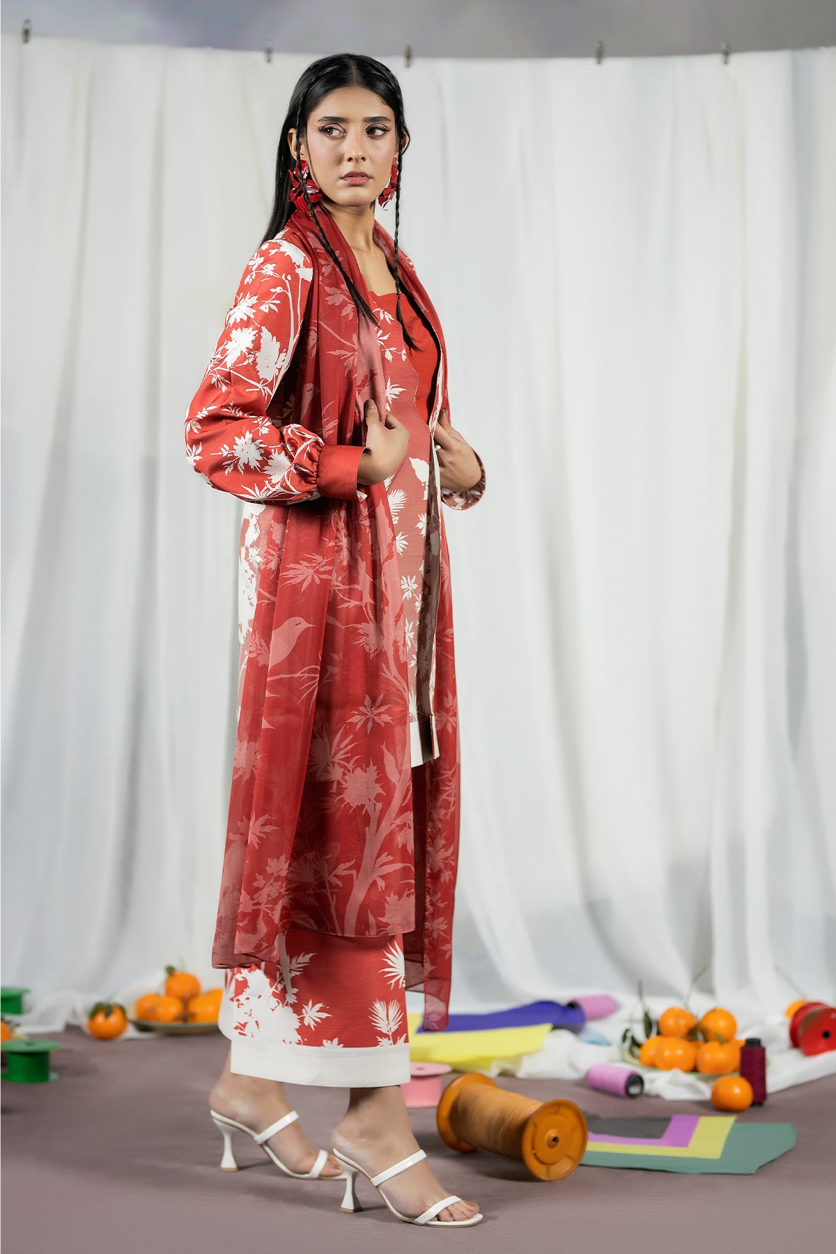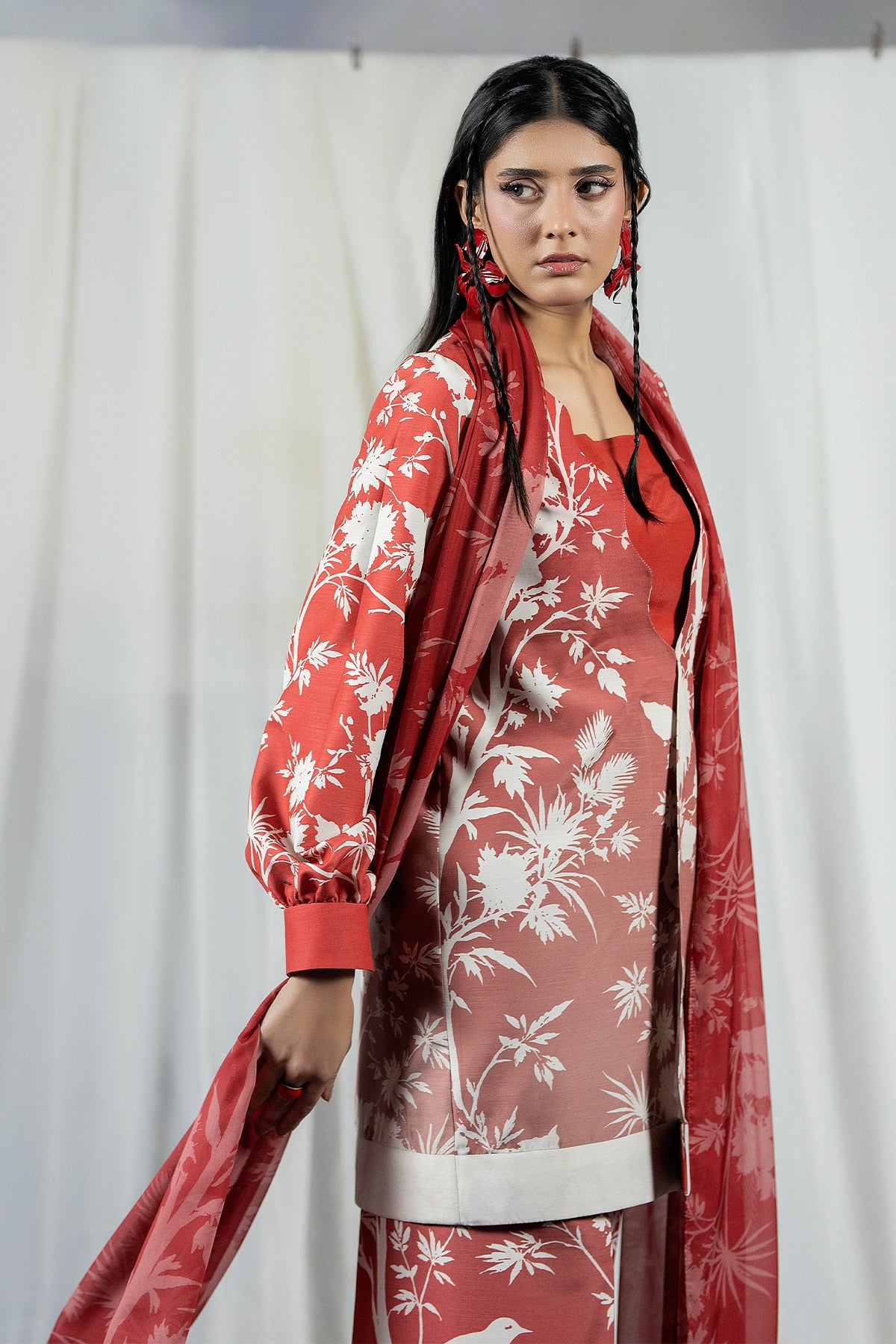 A Raw Silk three-piece in faded tones, pairing a printed jacket with an easy trouser and dupatta for relaxed Ramadan dressing inspired by the quiet vibrance of Basant.