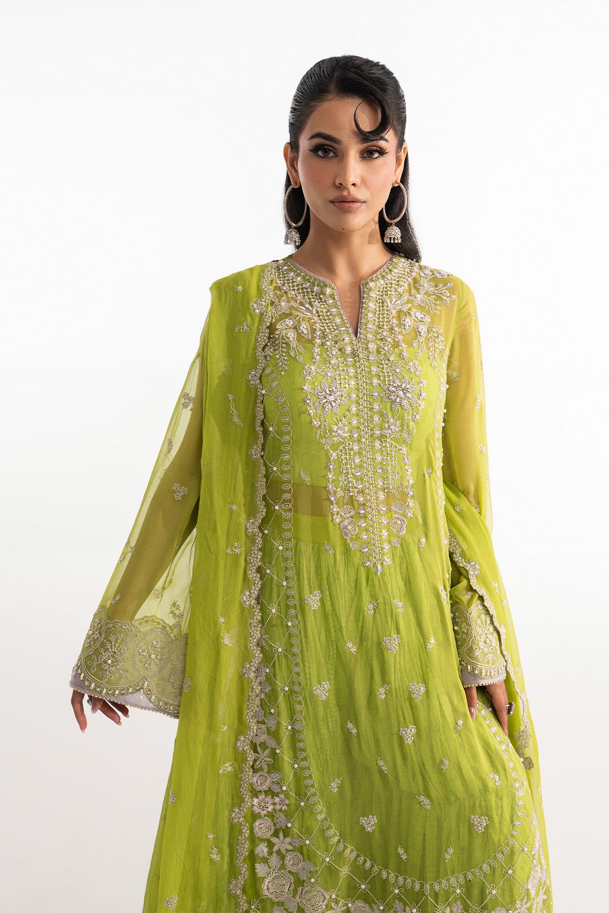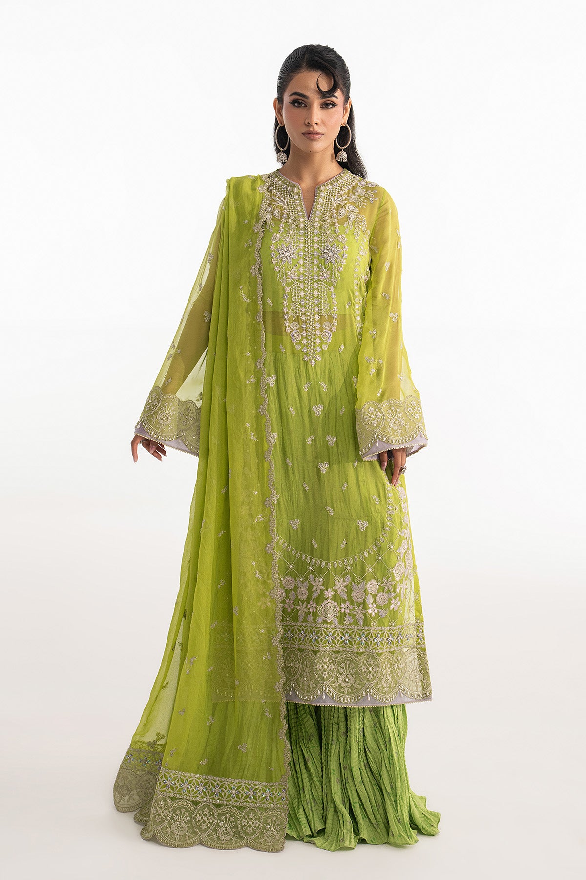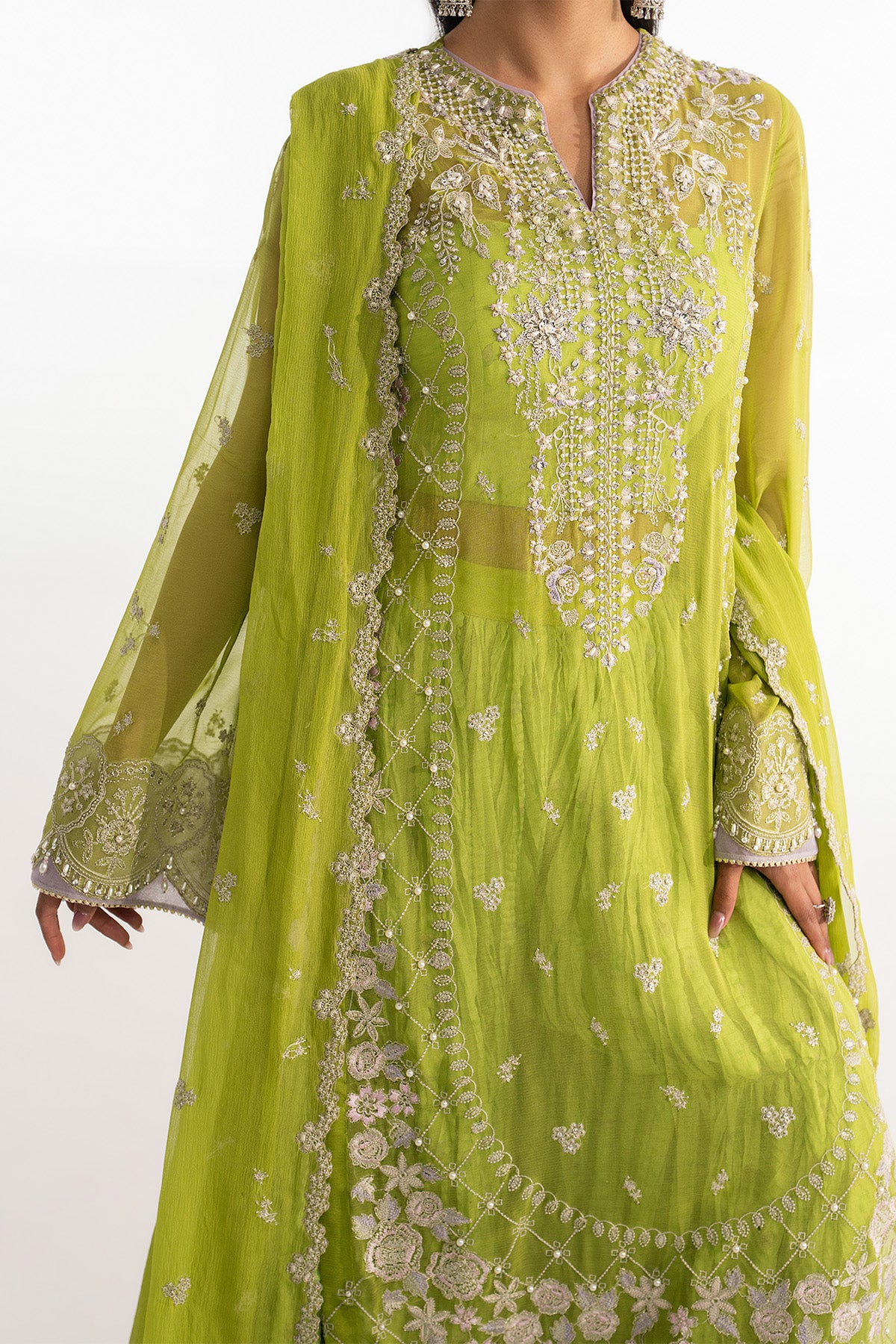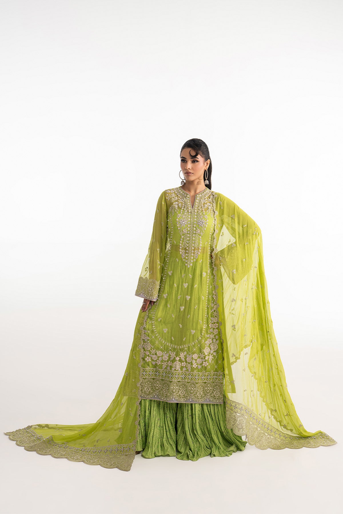 Turn heads this Eid with a delicate chiffon ensemble, where every detail tells a story. The shirt features full embroidery on the front and sleeves, while hand-placed pearls on the neckline bring a soft, luminous touch. Tassels on the sleeves add subtle elegance, complemented by a chiffon dupatta adorned with embroidered borders. Finished with printed medium silk gharara crushed pants, this outfit balances intricate craftsmanship with effortless grace, making it a standout choice for festive celebrations.