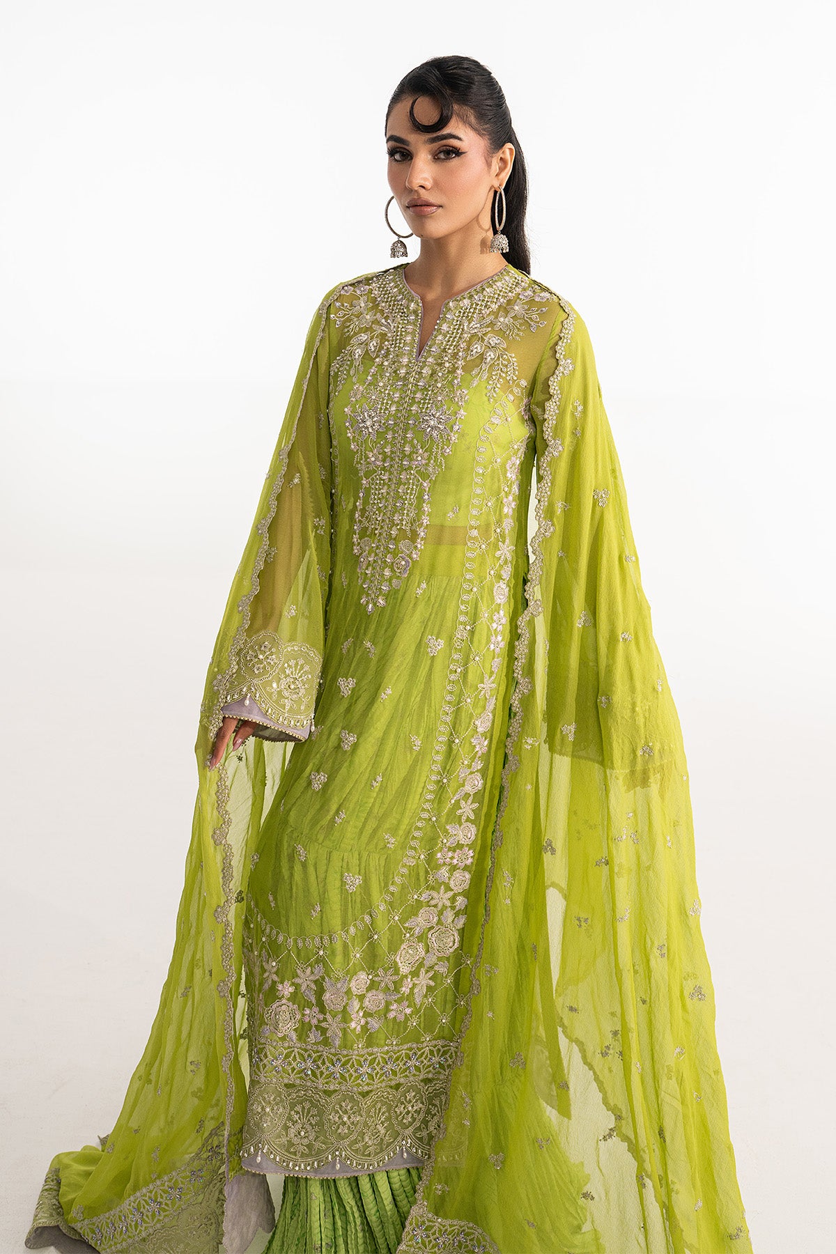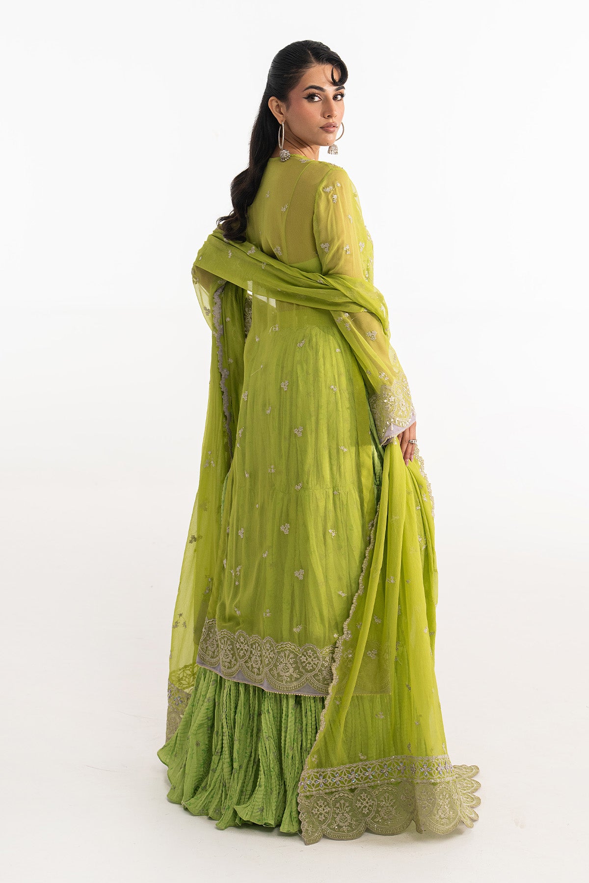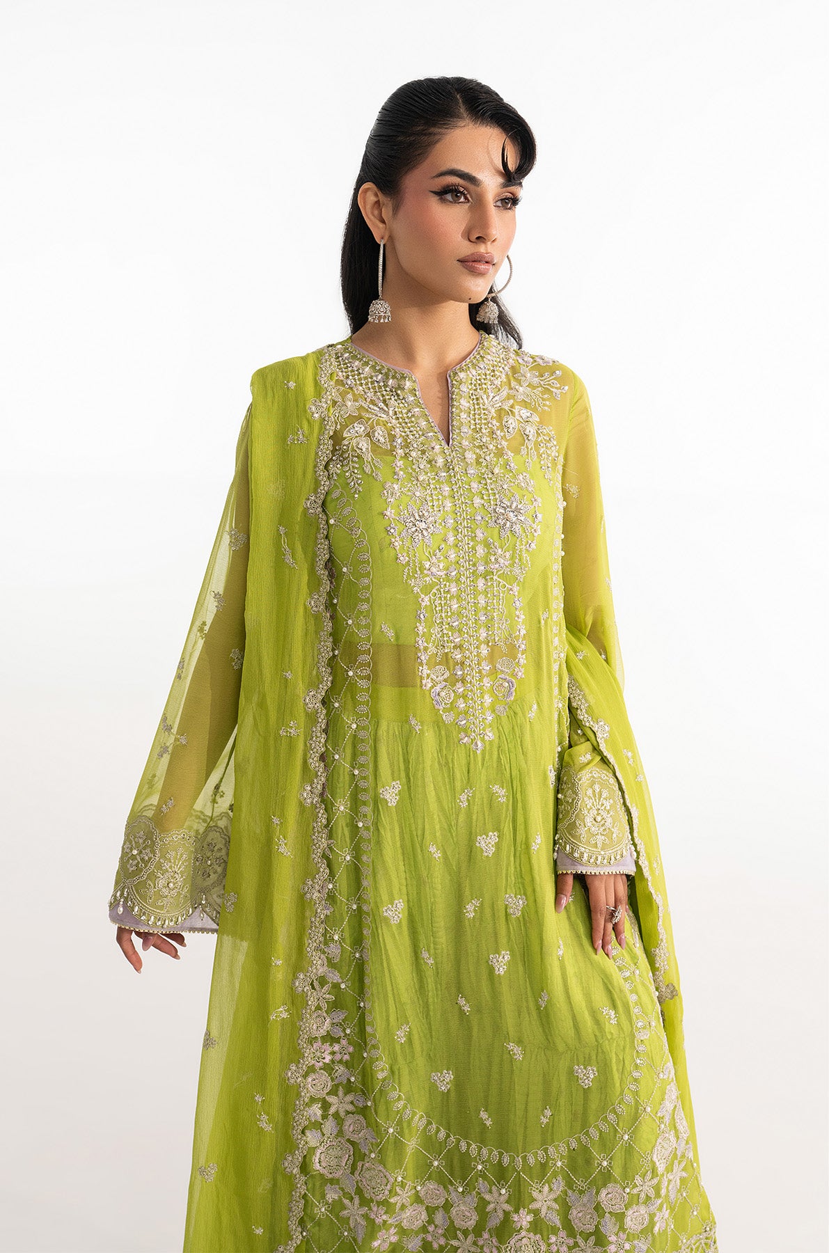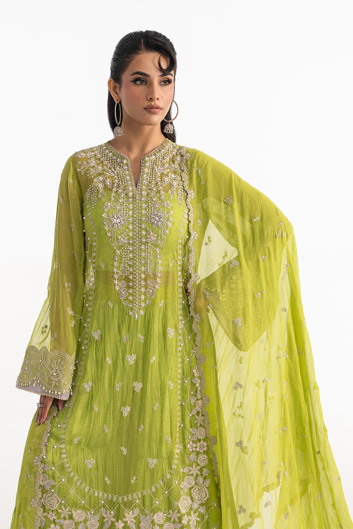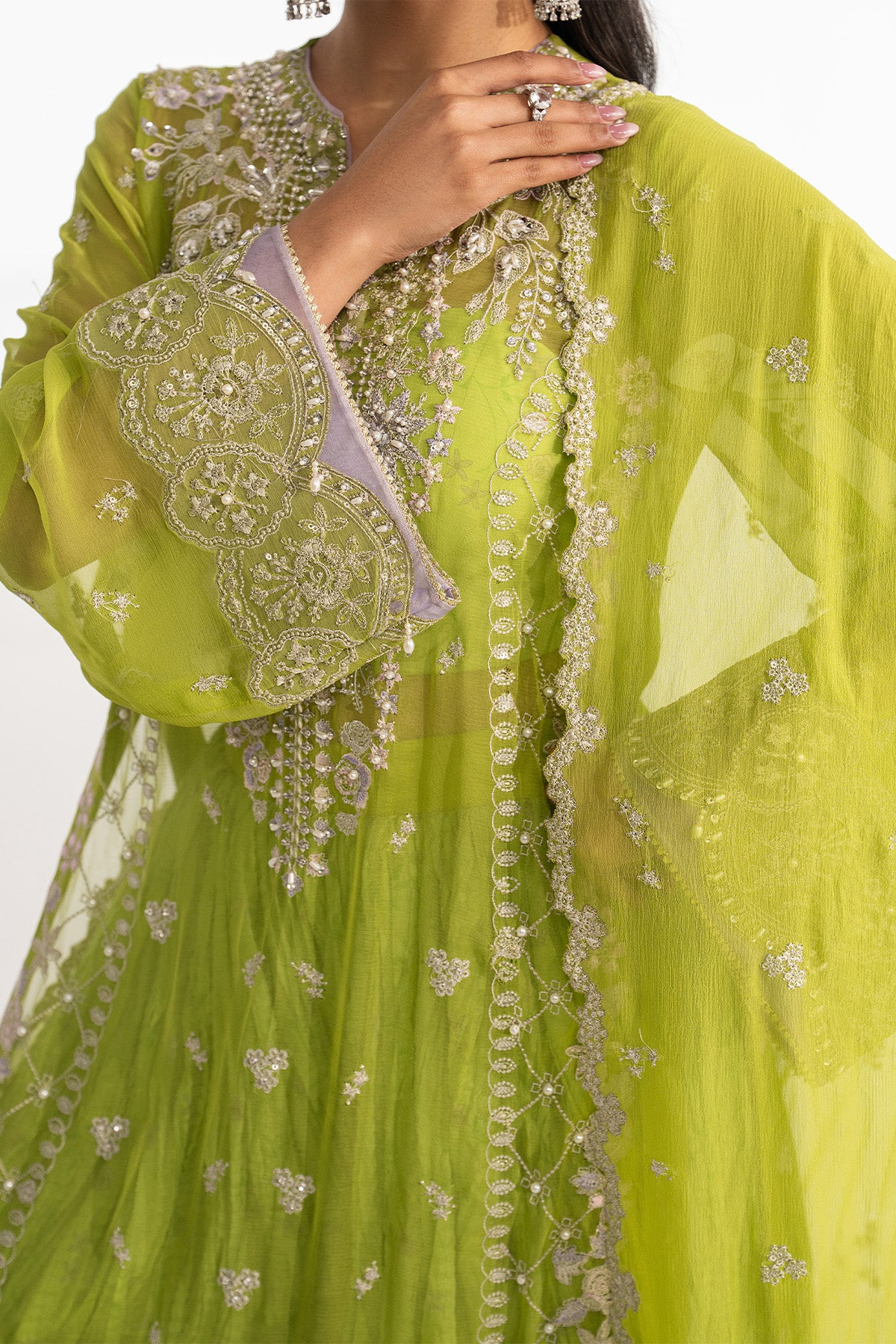 Turn heads this Eid with a delicate chiffon ensemble, where every detail tells a story. The shirt features full embroidery on the front and sleeves, while hand-placed pearls on the neckline bring a soft, luminous touch. Tassels on the sleeves add subtle elegance, complemented by a chiffon dupatta adorned with embroidered borders. Finished with printed medium silk gharara crushed pants, this outfit balances intricate craftsmanship with effortless grace, making it a standout choice for festive celebrations.
