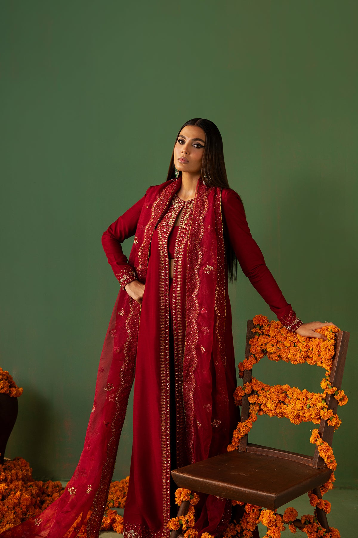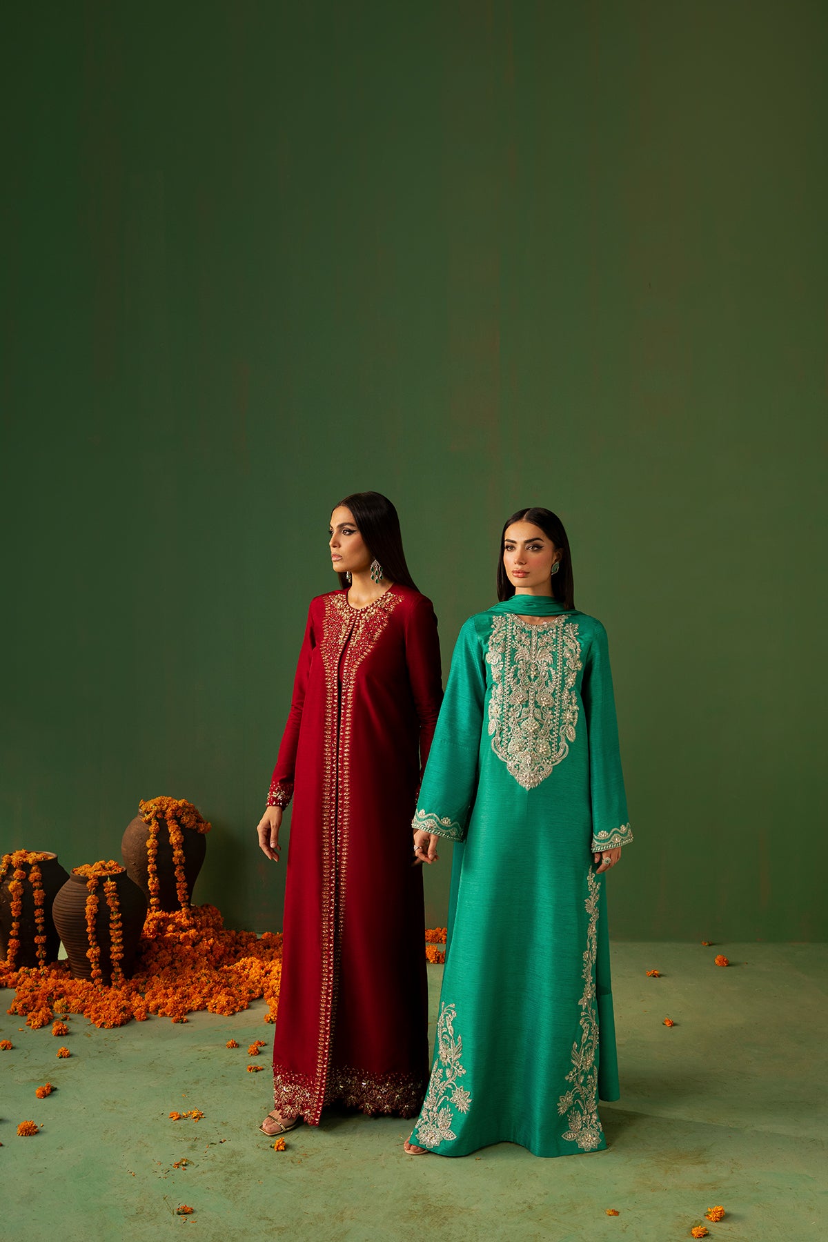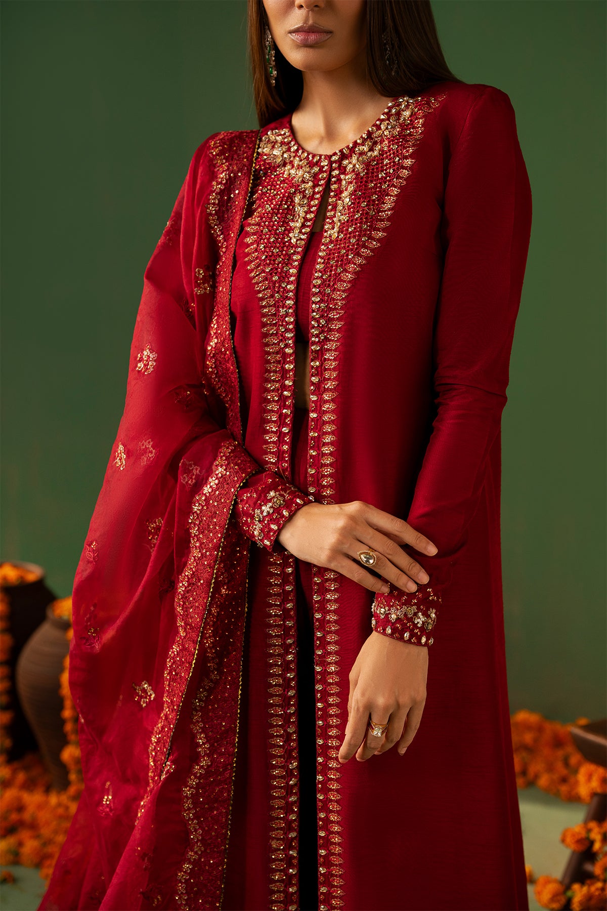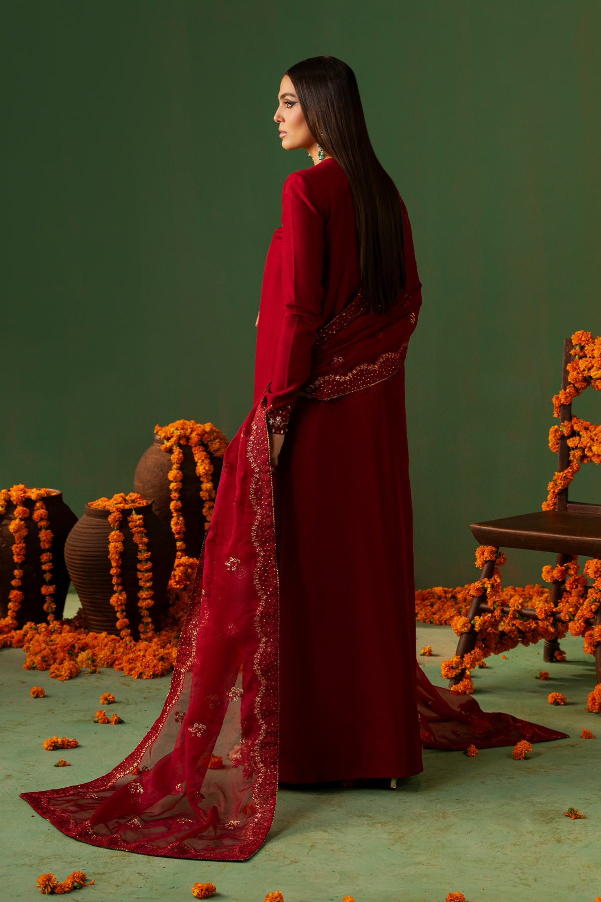 Deep maroon front-open long gown, paired with sleek straight cigarette pants, exudes classic grace. In Korean Raw Silk, this outfit is beautifully detailed with intricate hand embroidery and embellishments gracing the neckline and sleeves, with four-sided detailed borders on an Organza dupatta, making it a perfect statement piece for festive occasions.