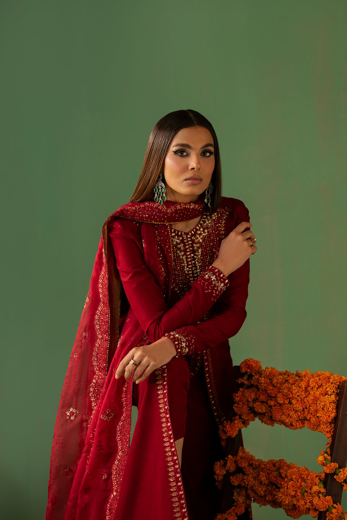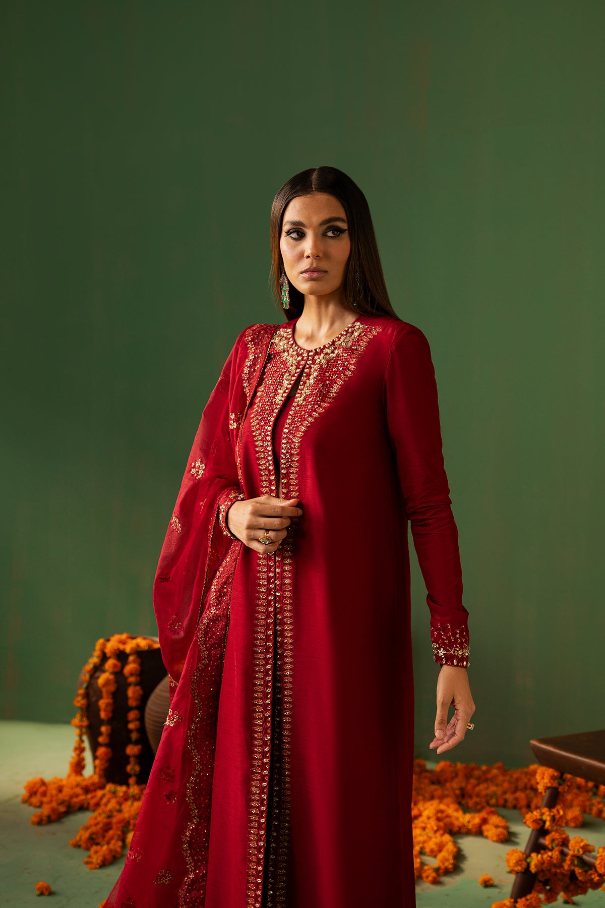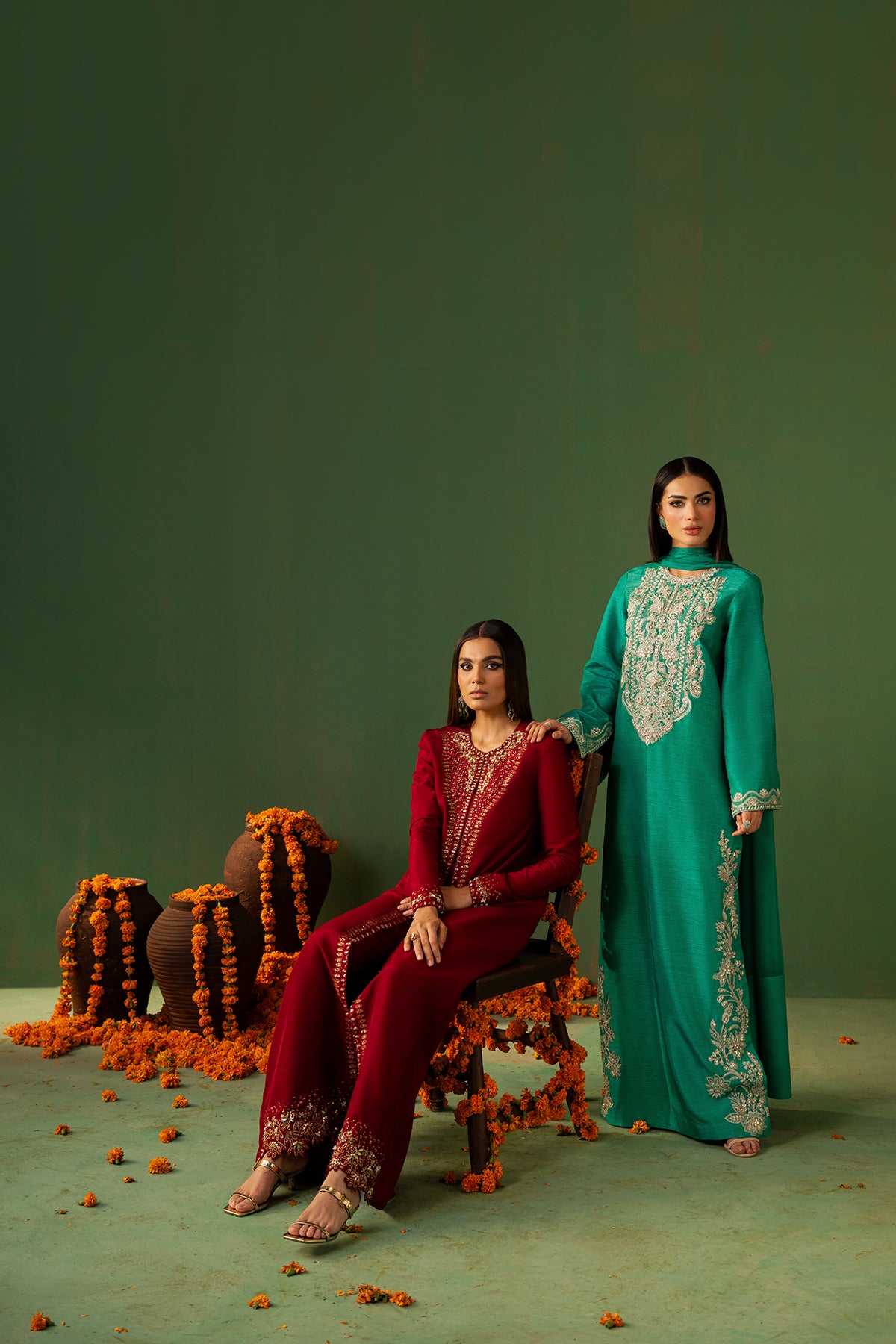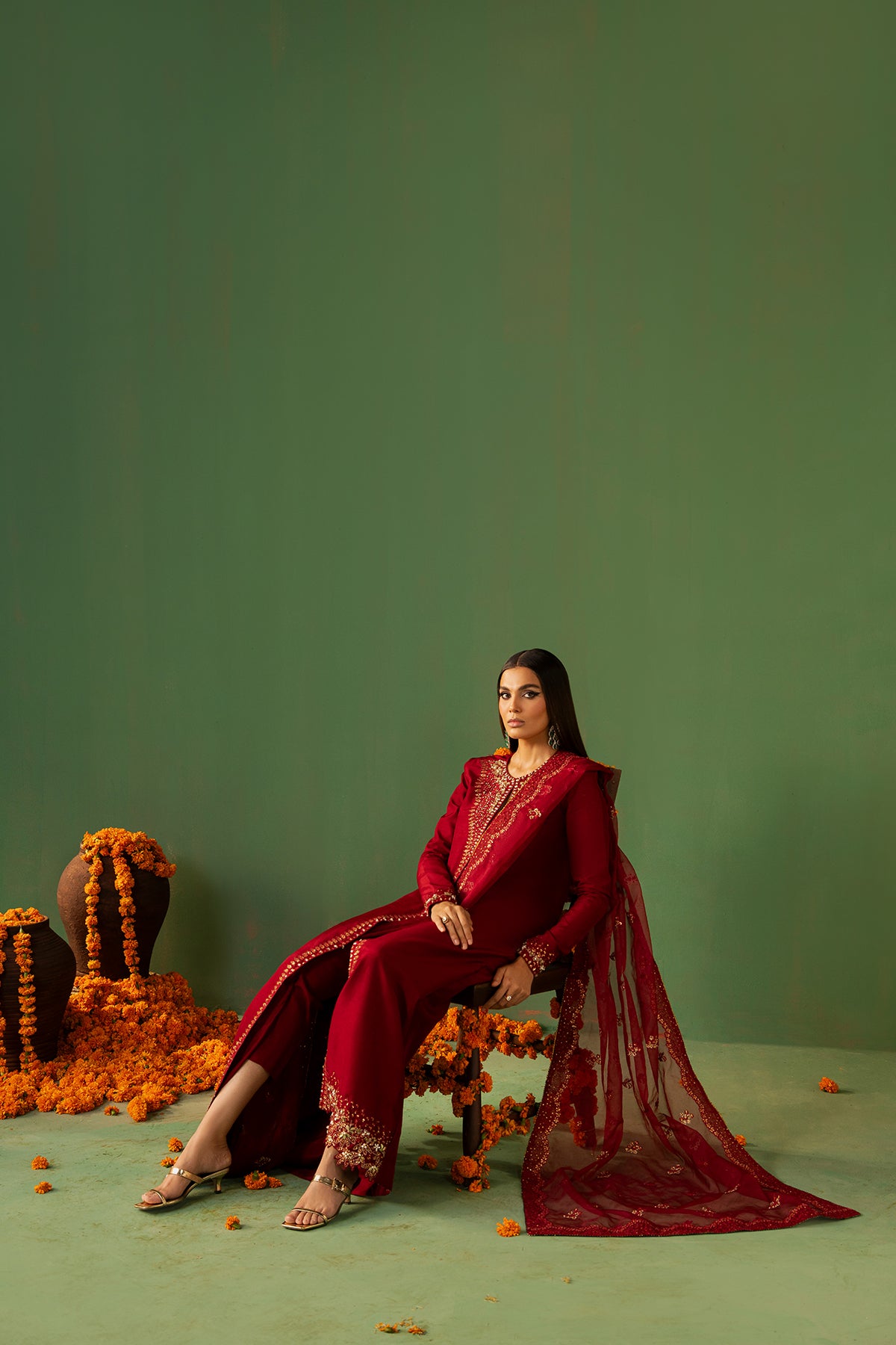 Deep maroon front-open long gown, paired with sleek straight cigarette pants, exudes classic grace. In Korean Raw Silk, this outfit is beautifully detailed with intricate hand embroidery and embellishments gracing the neckline and sleeves, with four-sided detailed borders on an Organza dupatta, making it a perfect statement piece for festive occasions.