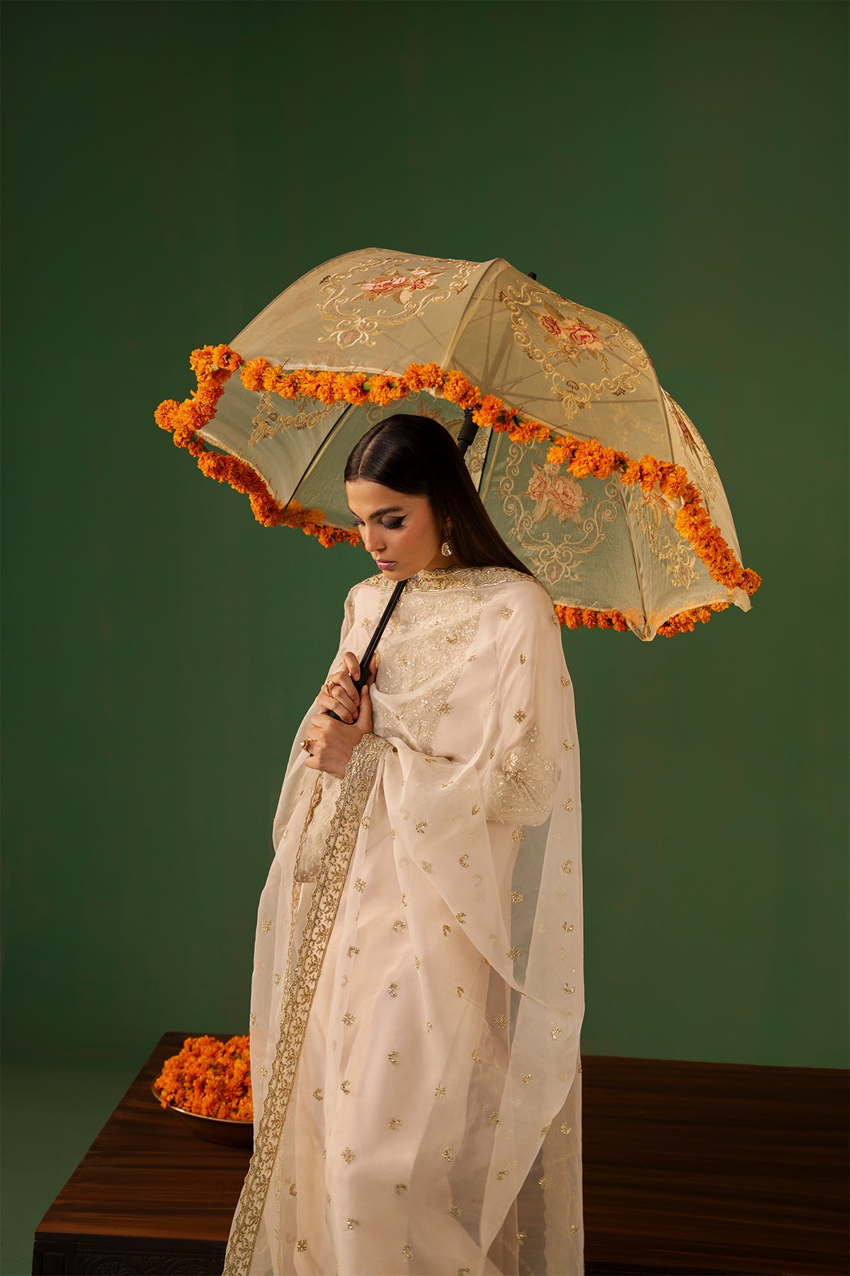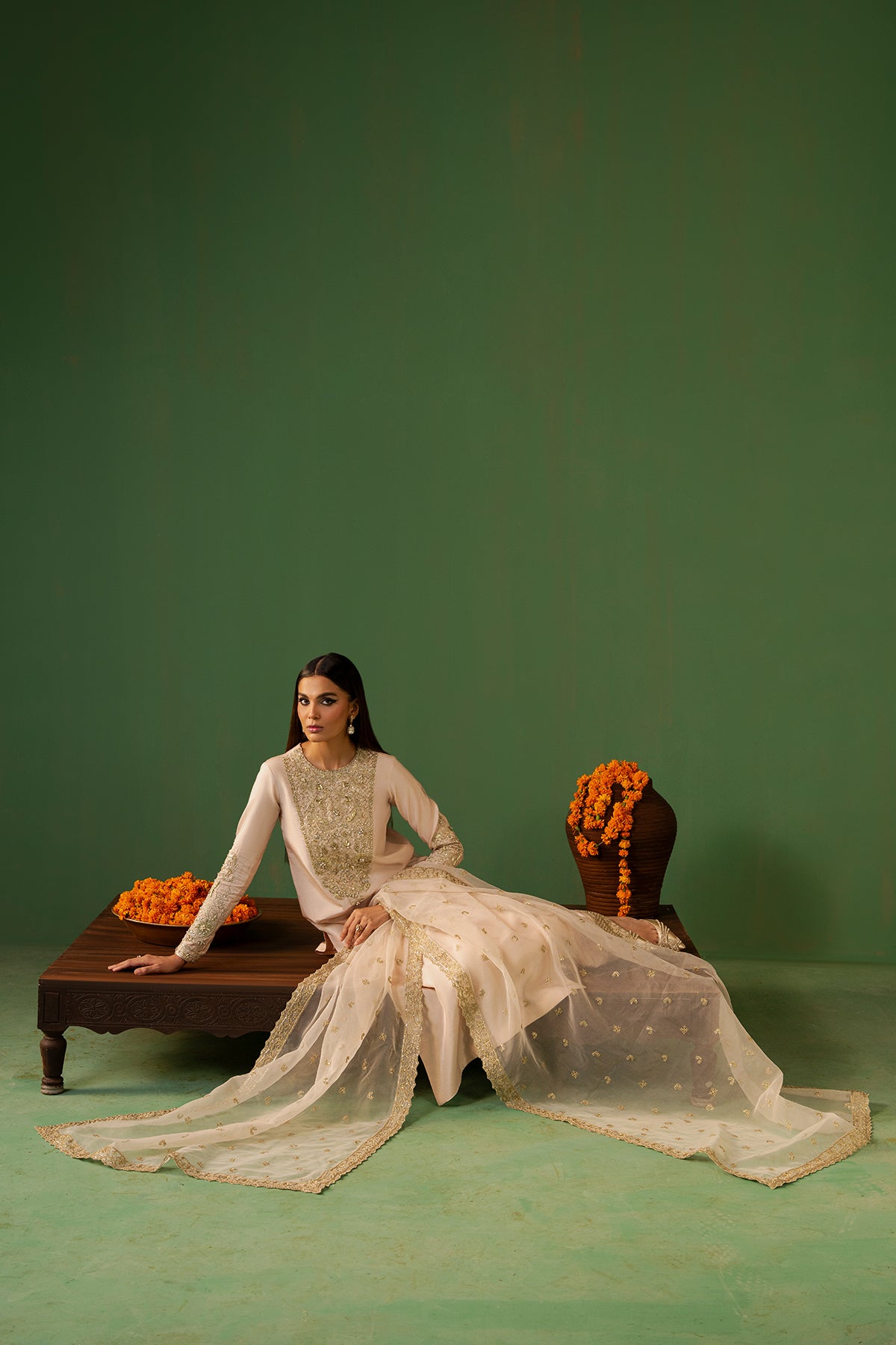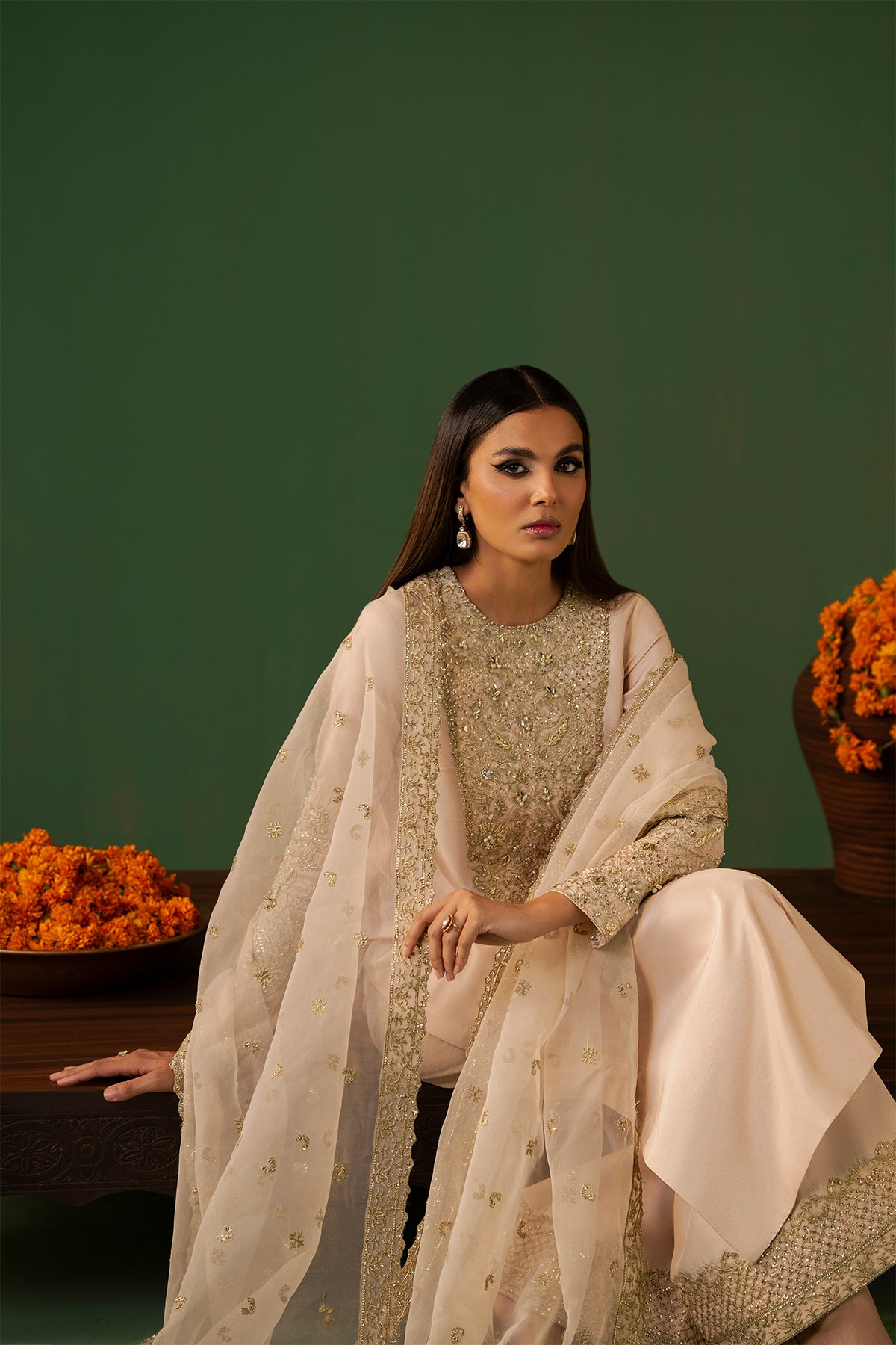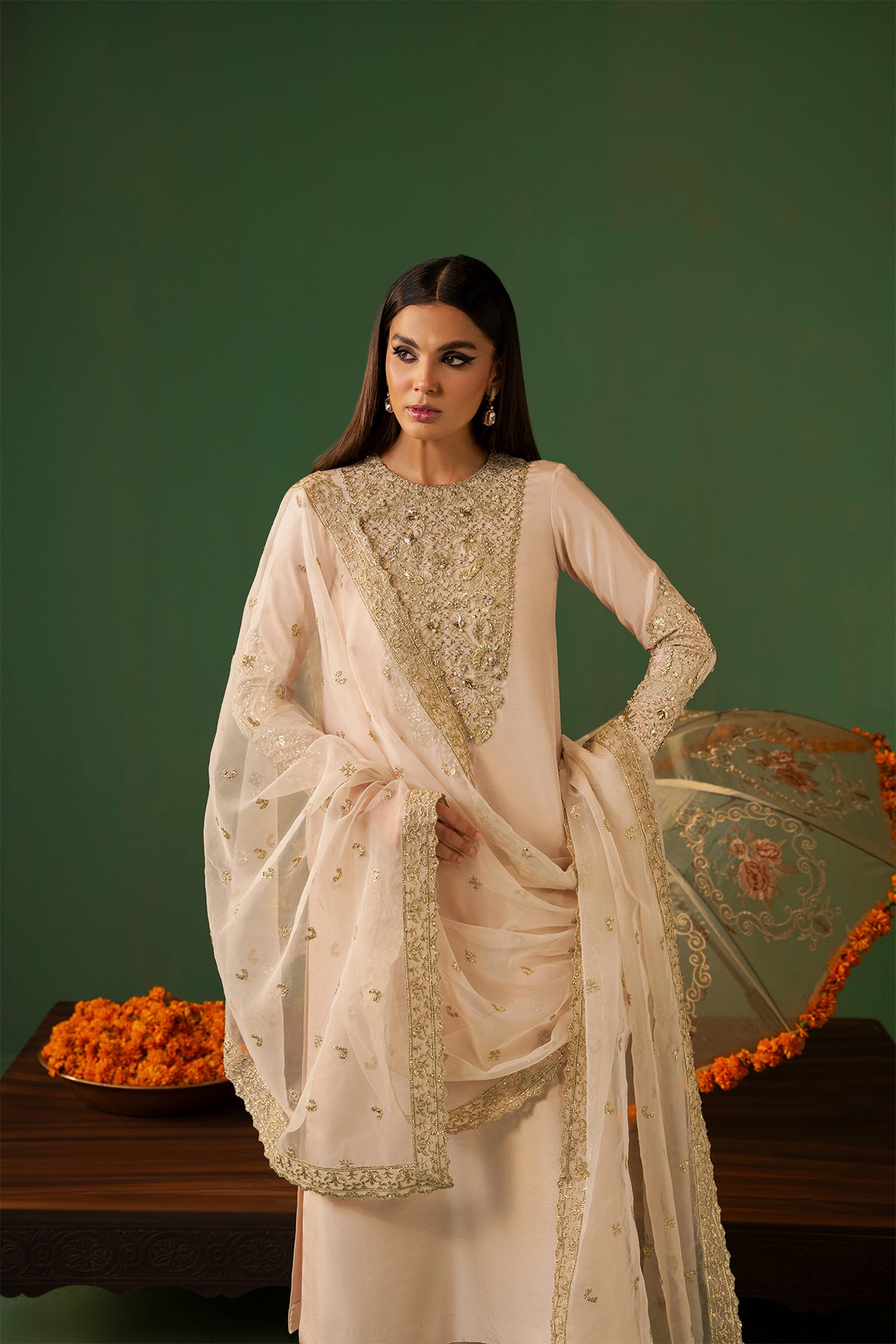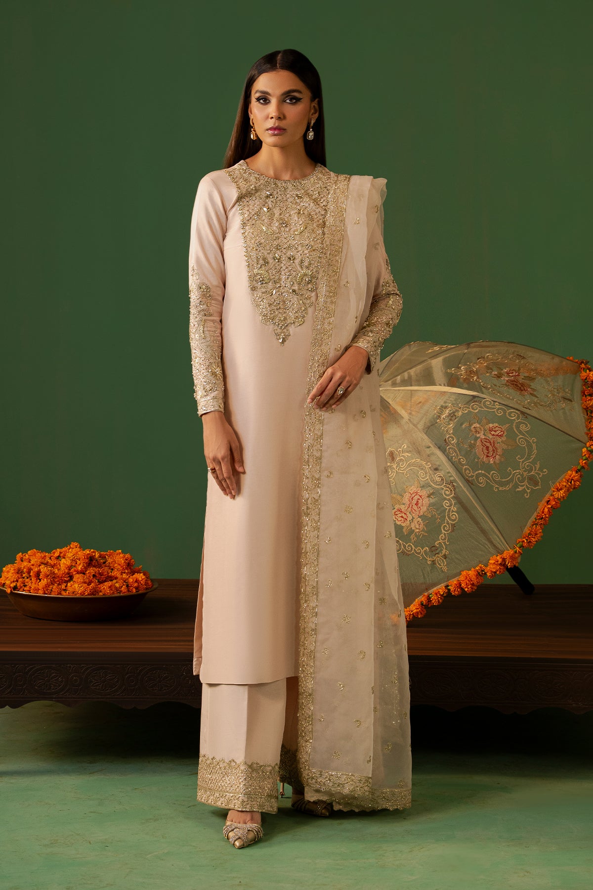 Leena is timeless beige outfit having a full-length shirt adorned with detailing of Swarovski crystals, pearls, cut dana, sequins, and gota lace. The design highlights a heavily embellished neckline and cuffs. In Tassar Silk fabric, paired with azar pants featuring delicate embellishments along the rounded hem. Completing the look is a beautifully crafted organza dupatta, intricately detailed all over, adding a touch of pure grace.