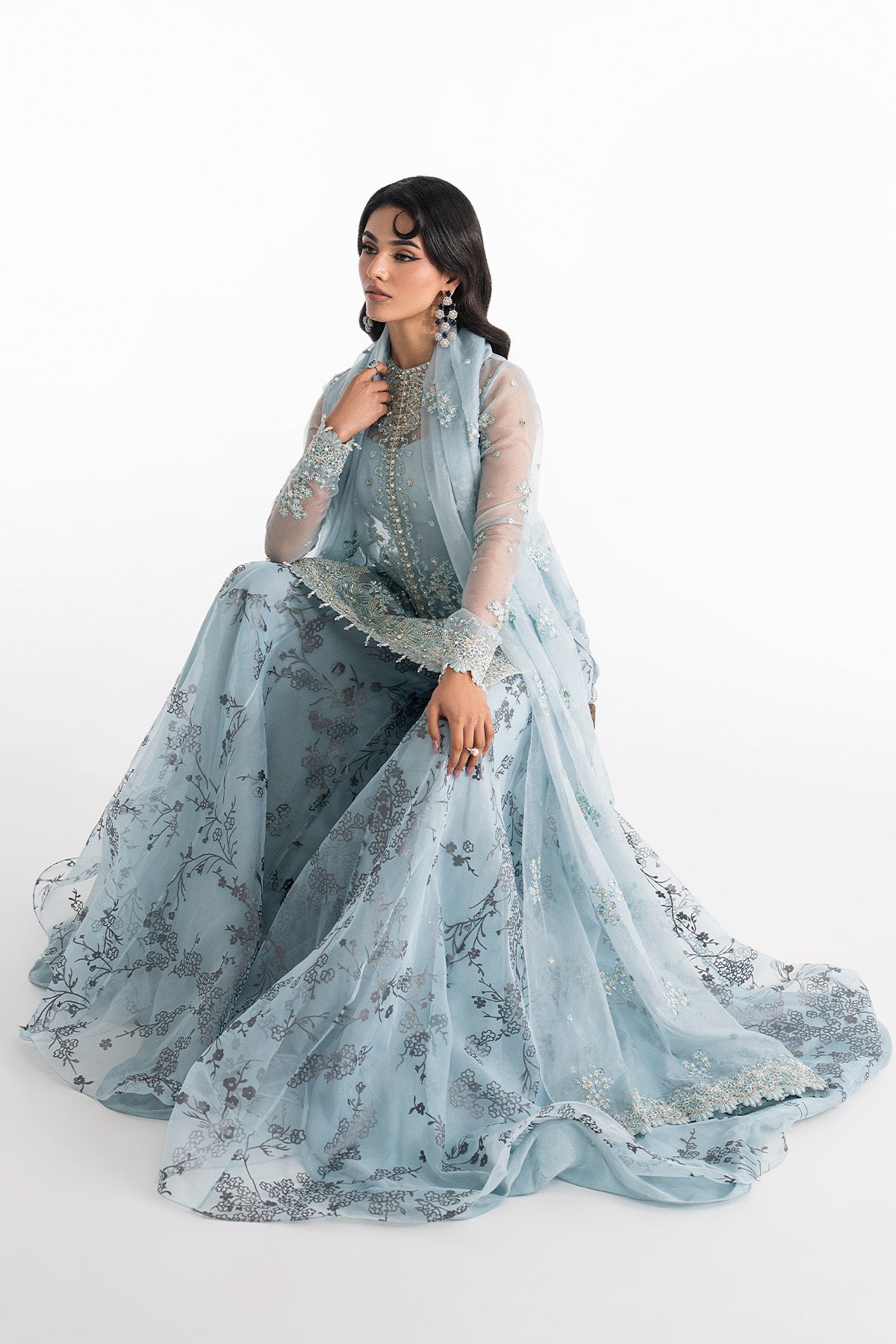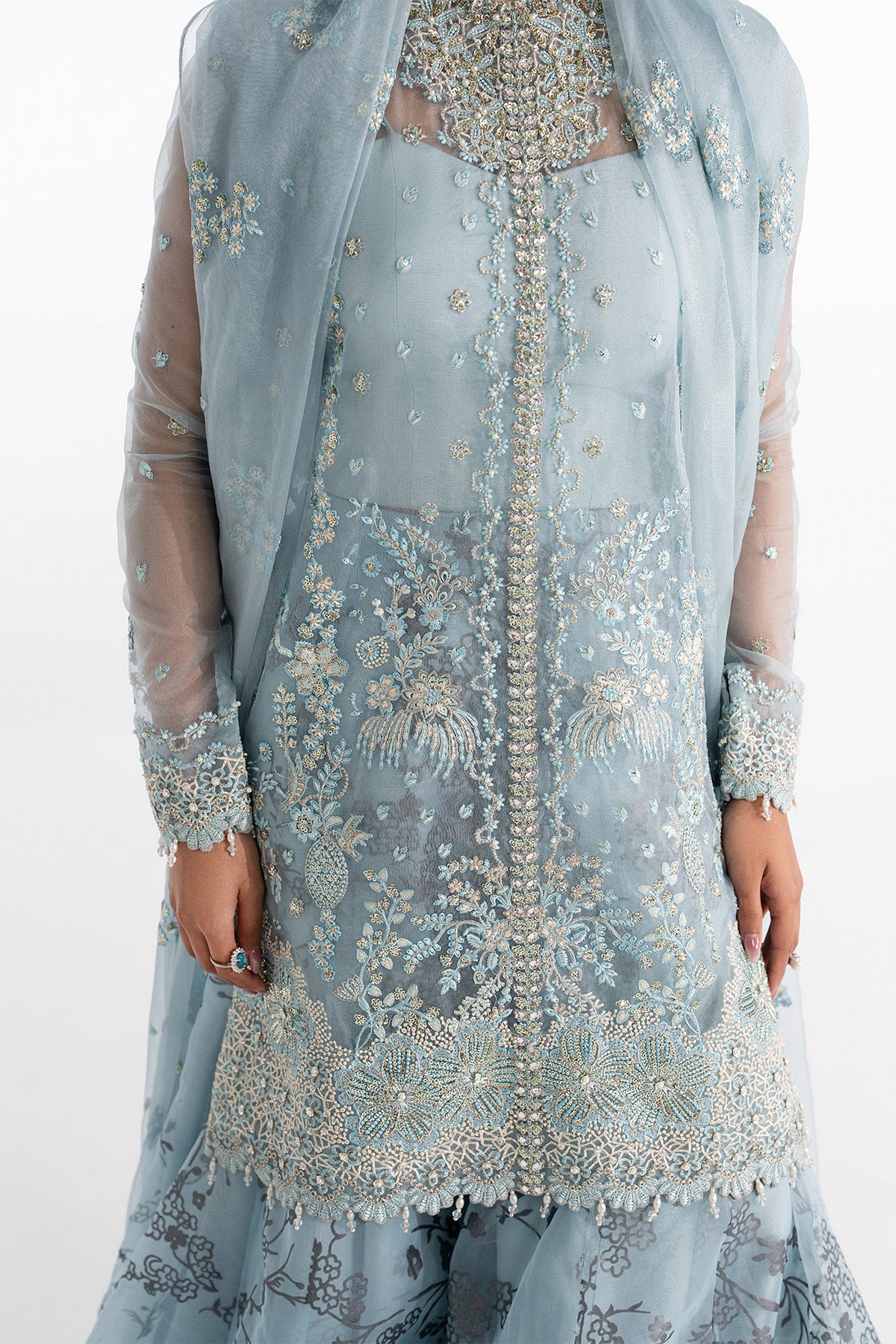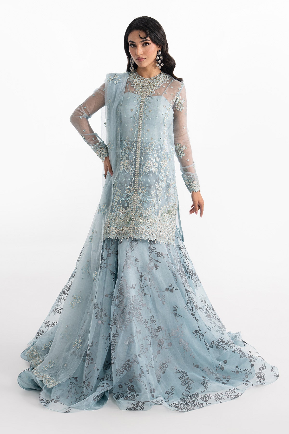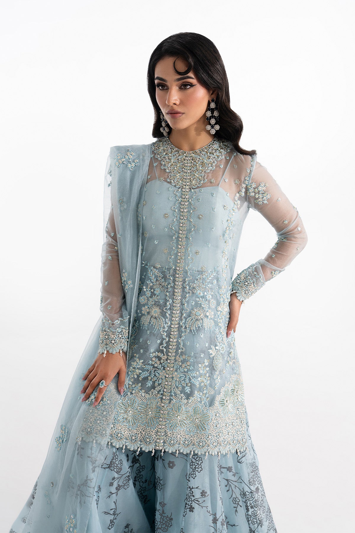 Make a festive statement this Eid with an organza ensemble featuring a short shirt fully embroidered on the front and sleeves. The neckline is lifted with exquisite handwork of pearls, with delicate hand embellishments elevating the embroidery. Tassels on the sleeves and shirt border add a playful, elegant touch. Paired with a printed organza sharara and a delicately embroidered organza dupatta, this outfit blends craftsmanship and festive charm, making it a true statement piece for Eid.