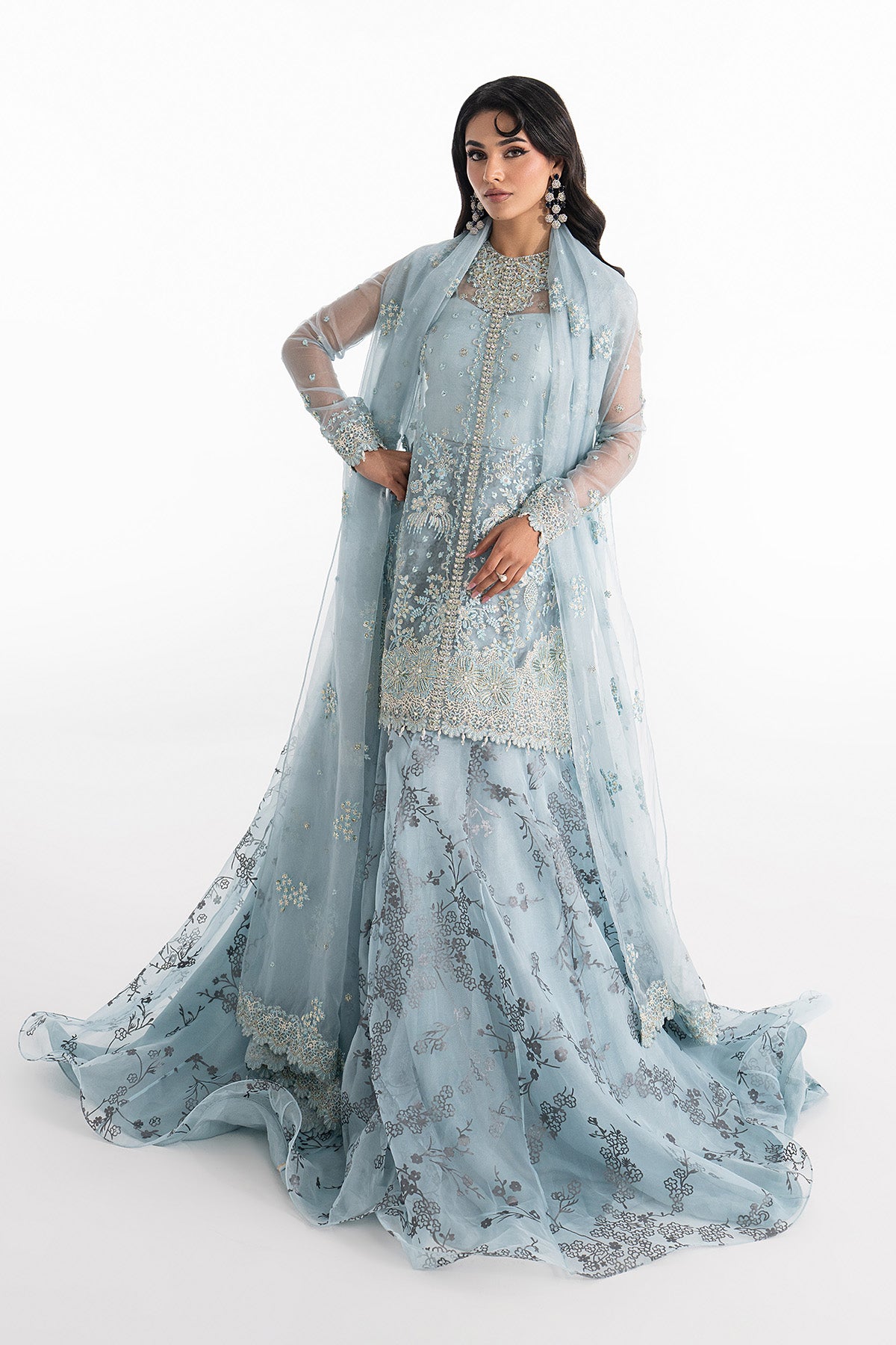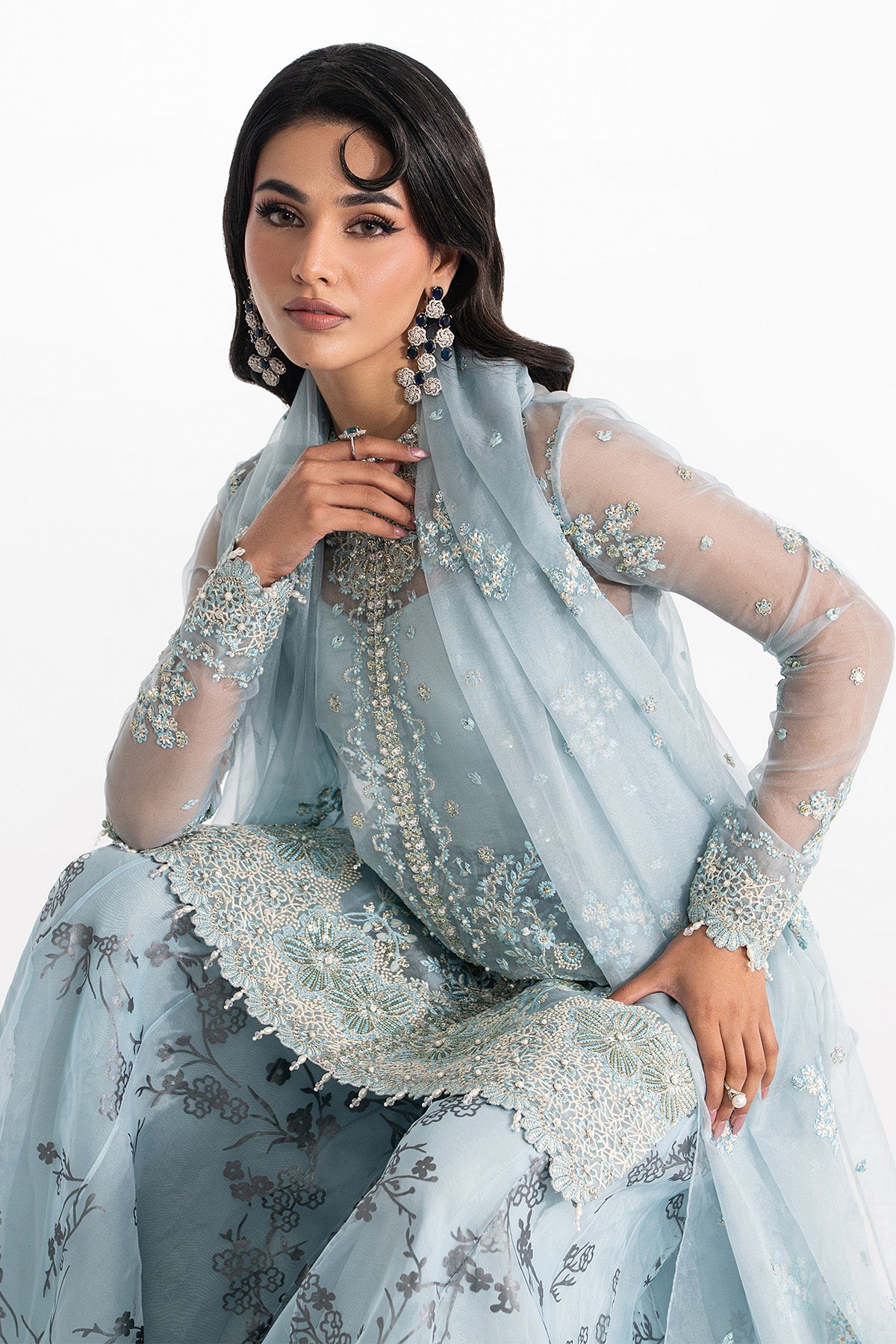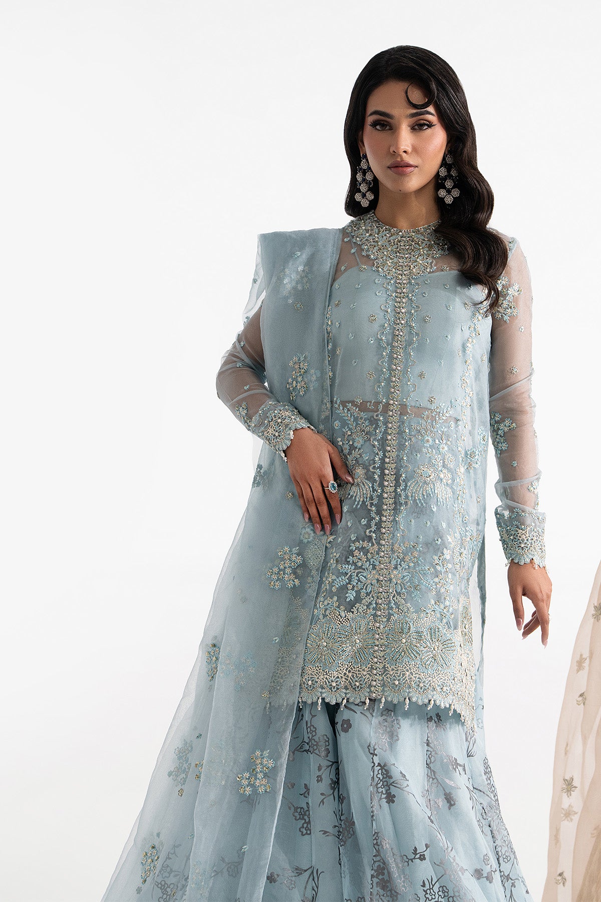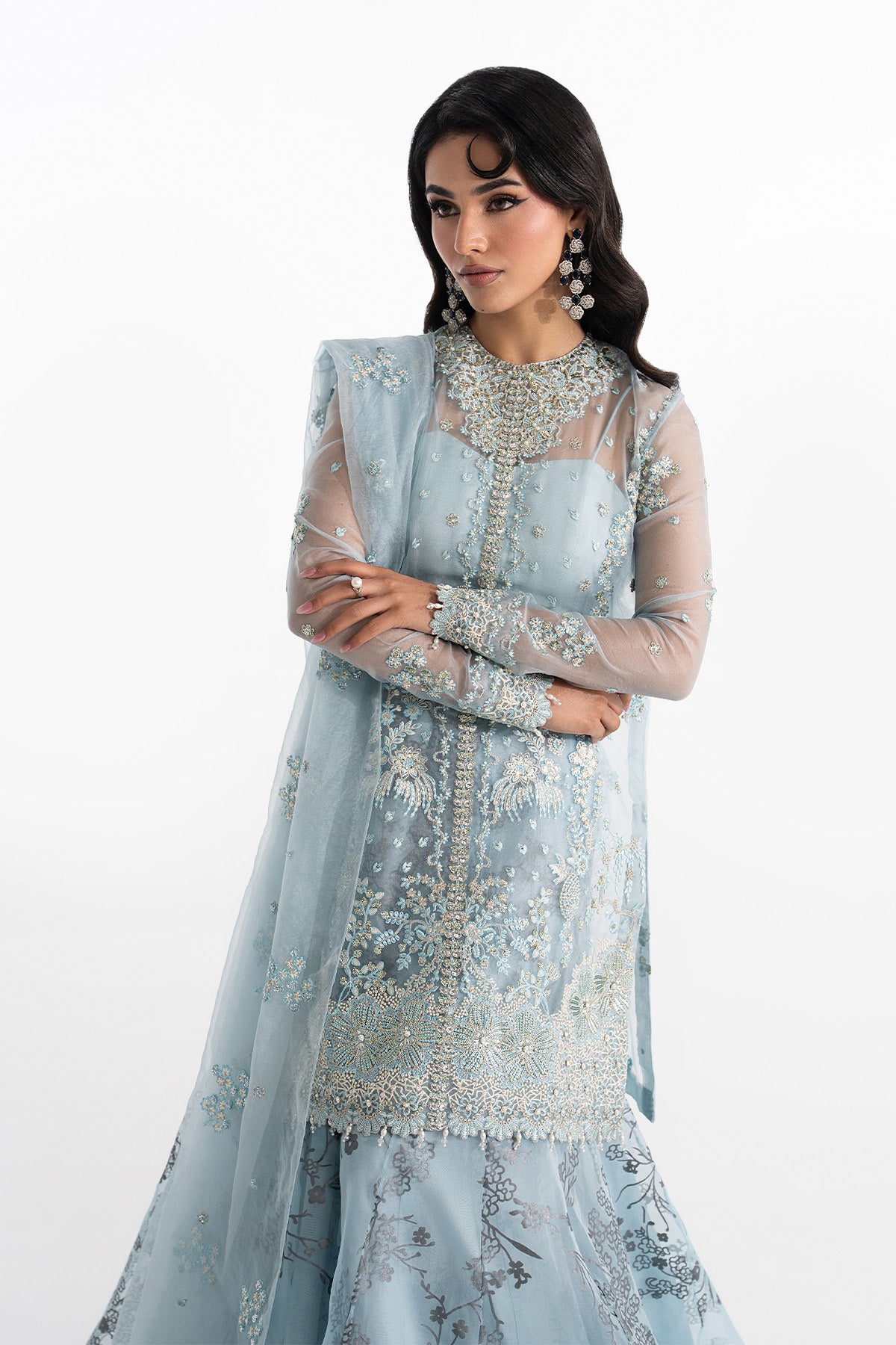 Make a festive statement this Eid with an organza ensemble featuring a short shirt fully embroidered on the front and sleeves. The neckline is lifted with exquisite handwork of pearls, with delicate hand embellishments elevating the embroidery. Tassels on the sleeves and shirt border add a playful, elegant touch. Paired with a printed organza sharara and a delicately embroidered organza dupatta, this outfit blends craftsmanship and festive charm, making it a true statement piece for Eid.