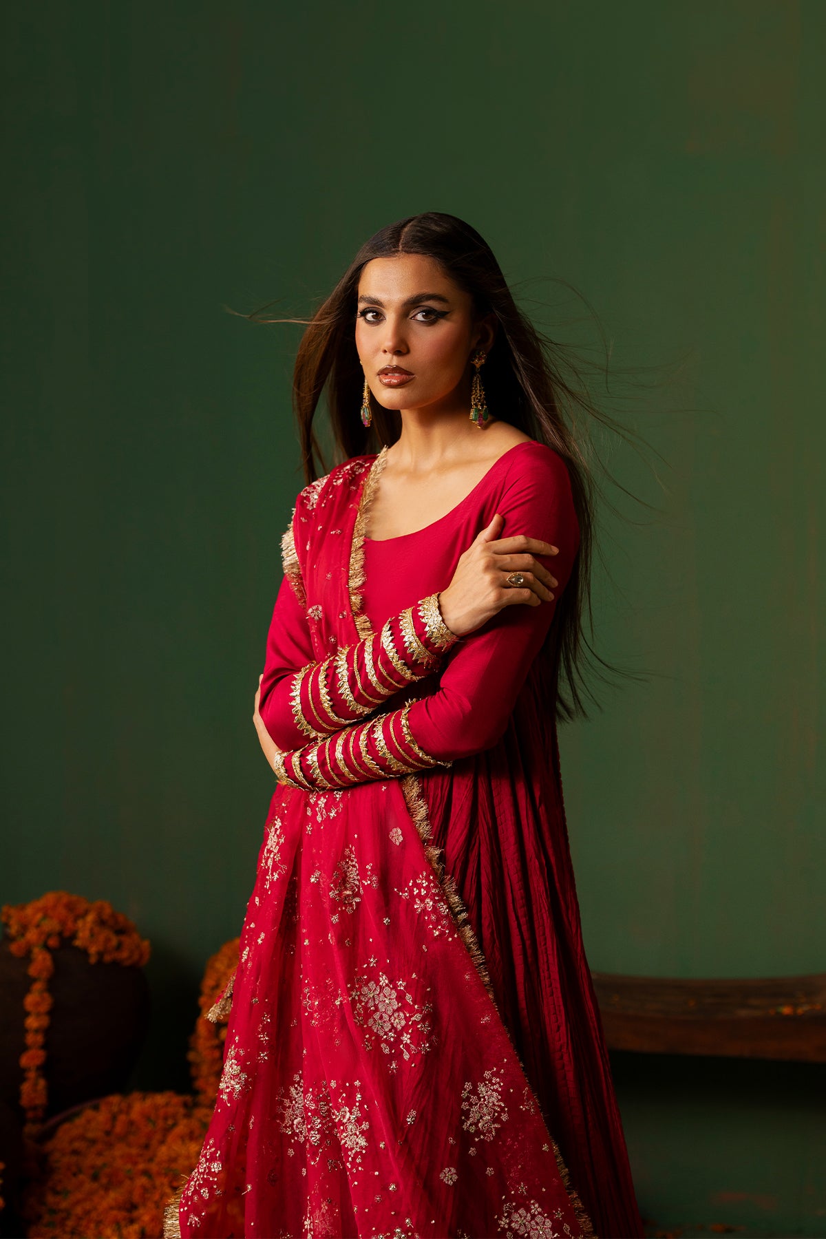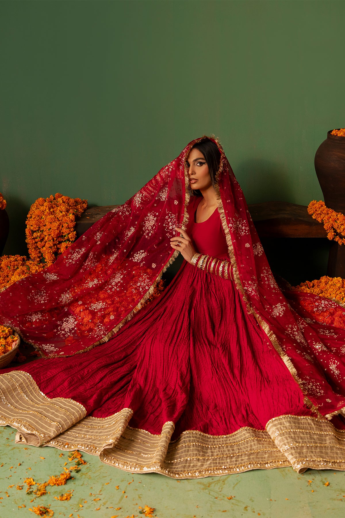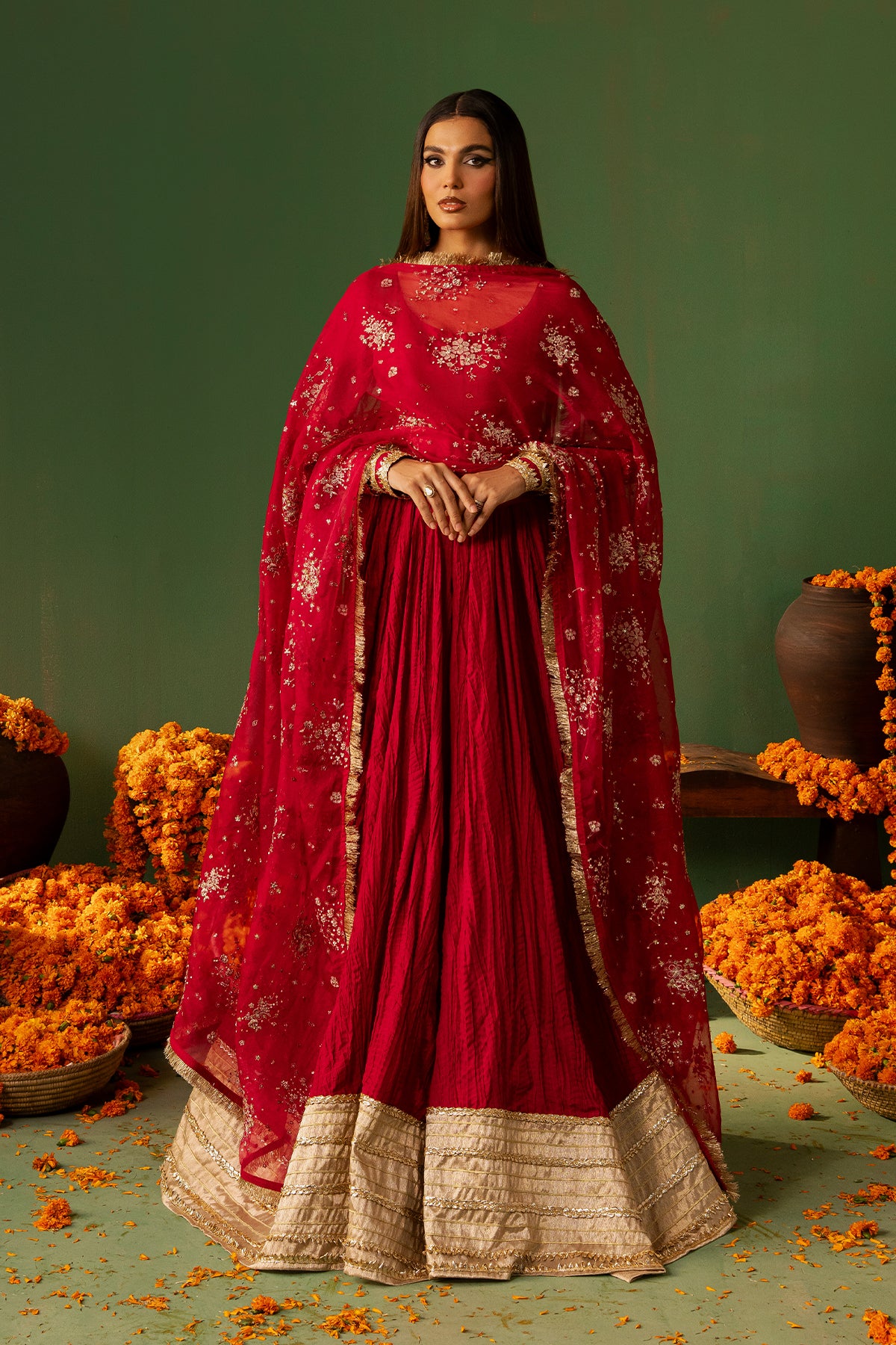 A radiant hot pink pishwas made with meticulous accents of goti, gota work, and keran lace in harmonious hues. The voluminous flare flows with effortless elegance, while the organza dupatta, adorned with embellishments, adds a touch of classic charm and completes this graceful, festive look.