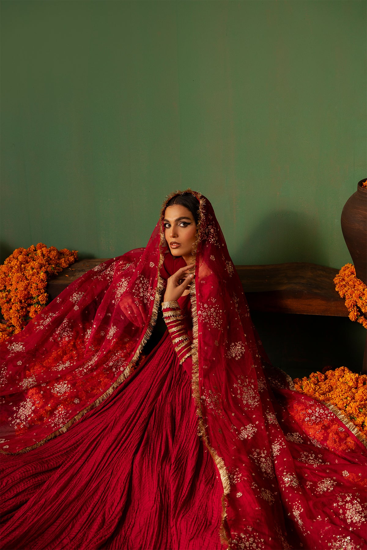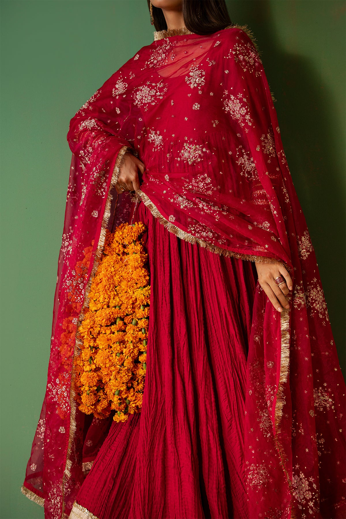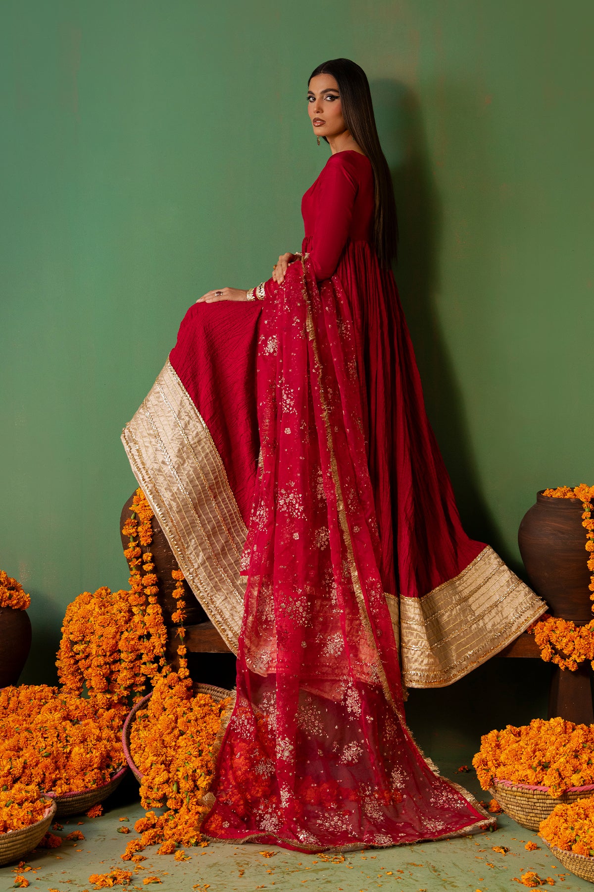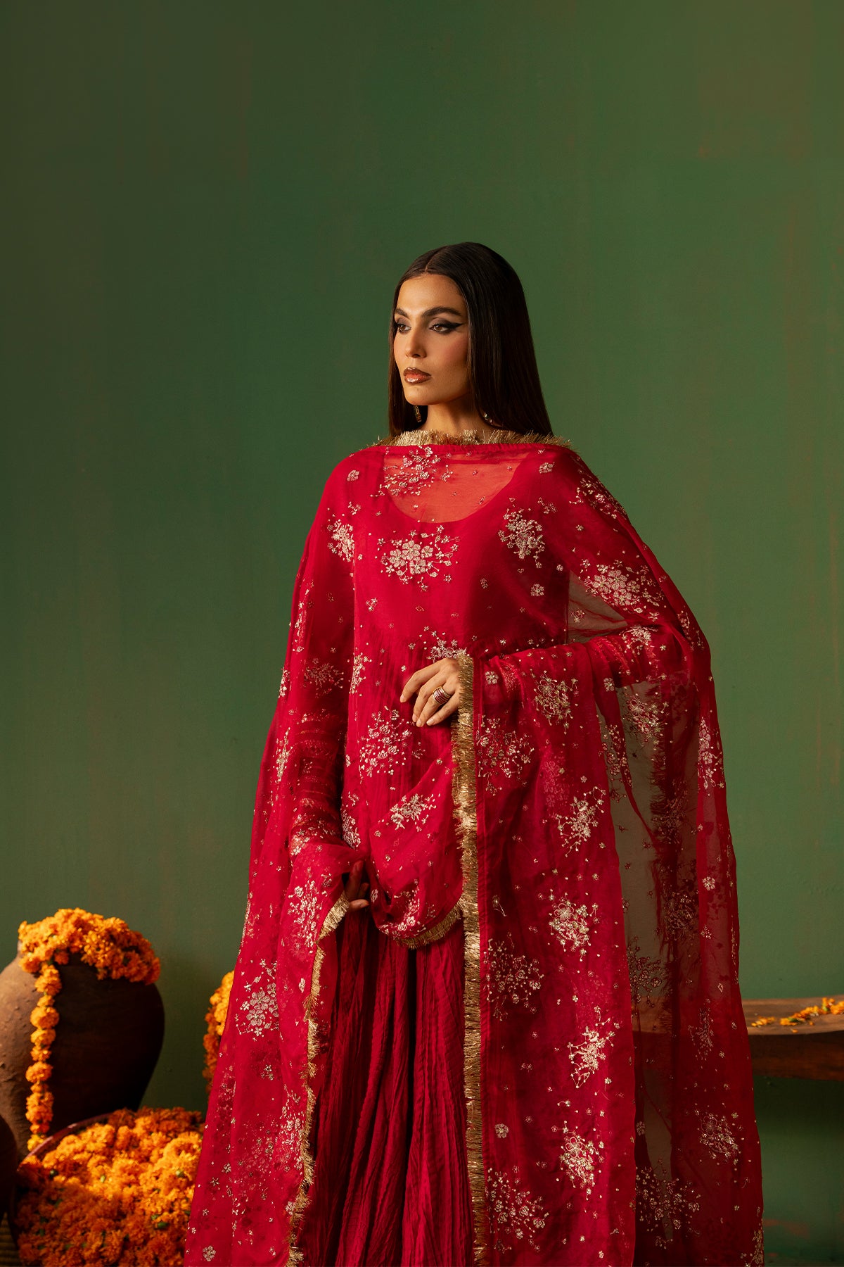 A radiant hot pink pishwas made with meticulous accents of goti, gota work, and keran lace in harmonious hues. The voluminous flare flows with effortless elegance, while the organza dupatta, adorned with embellishments, adds a touch of classic charm and completes this graceful, festive look.