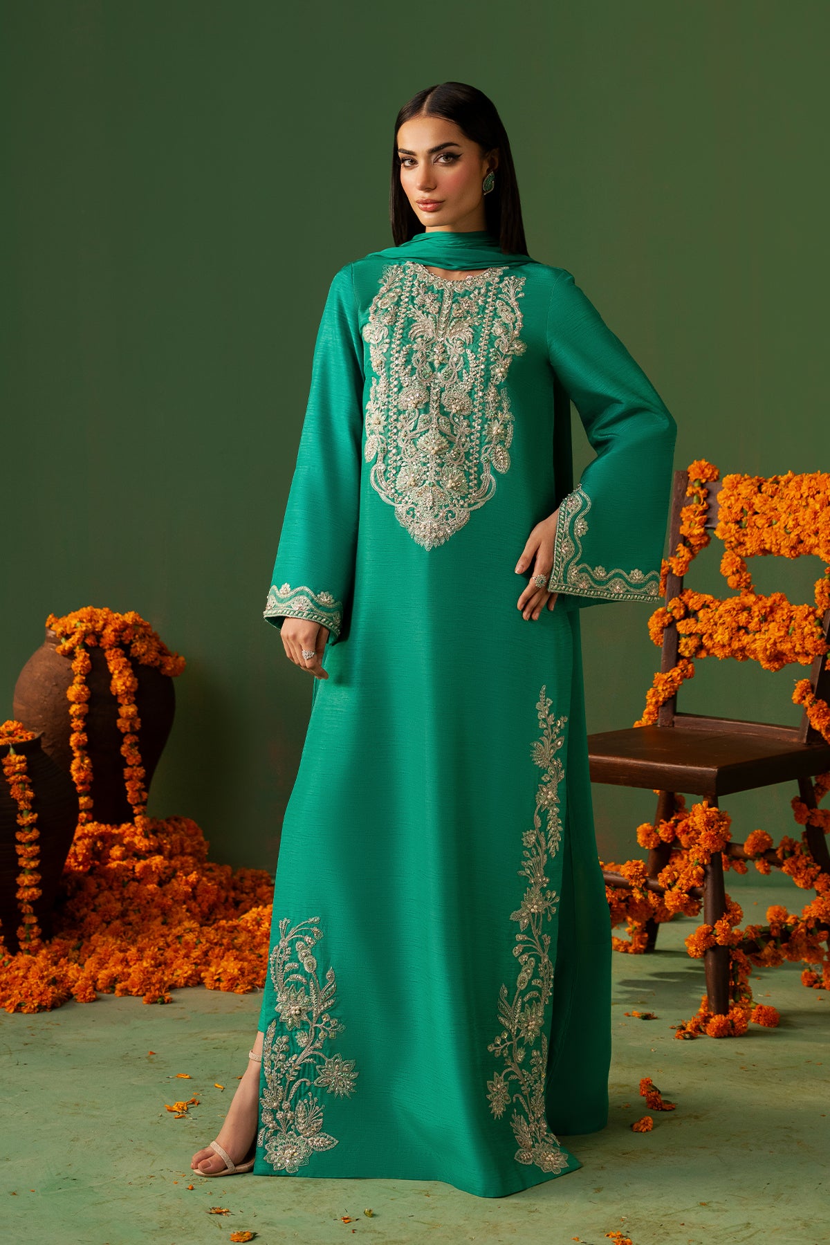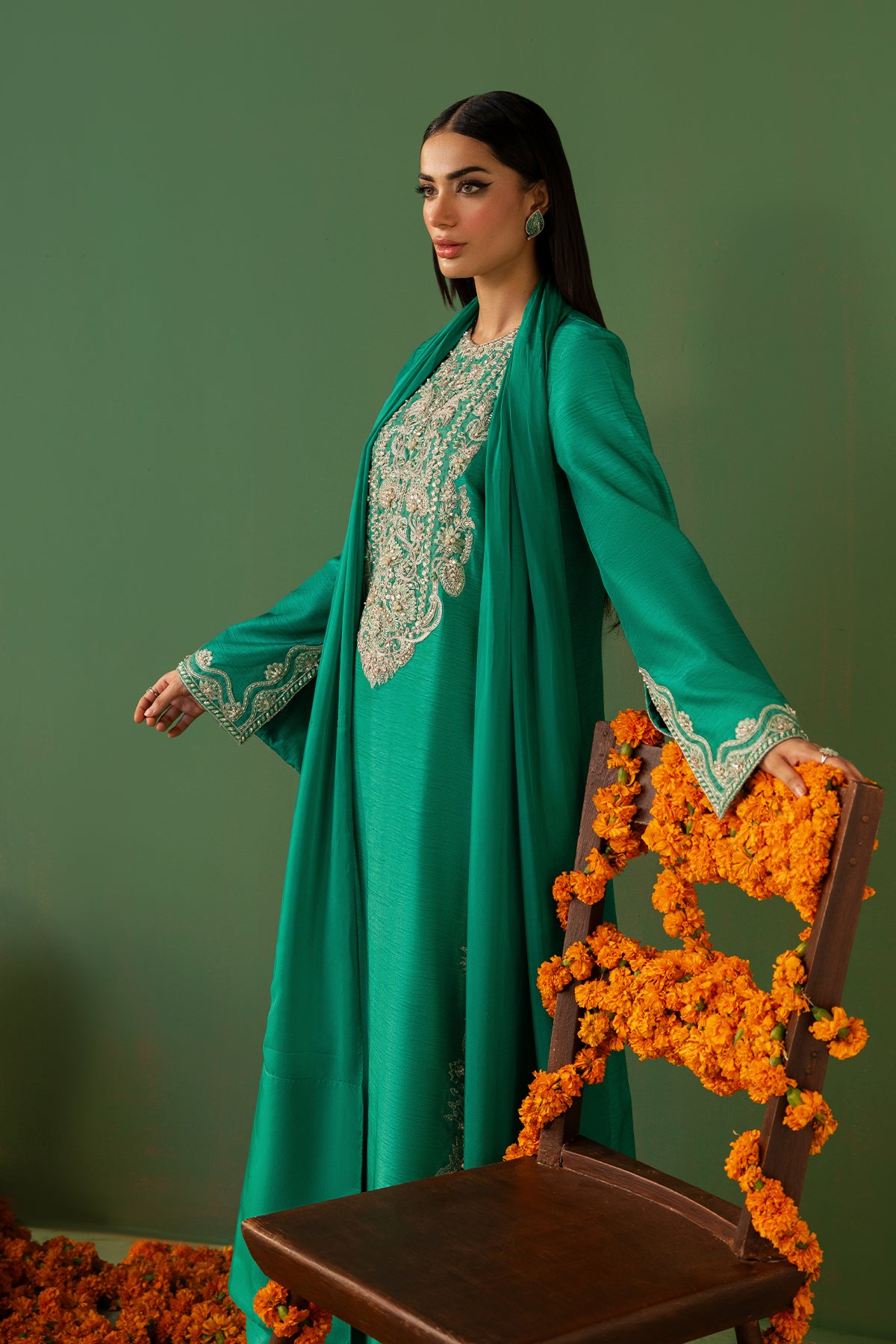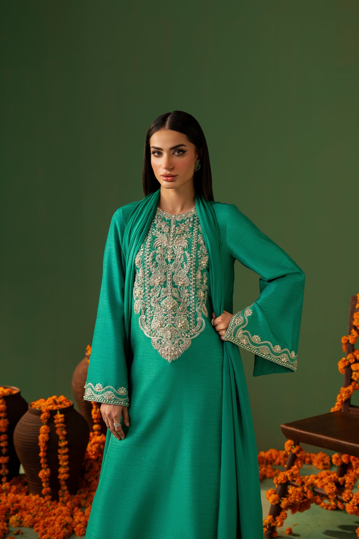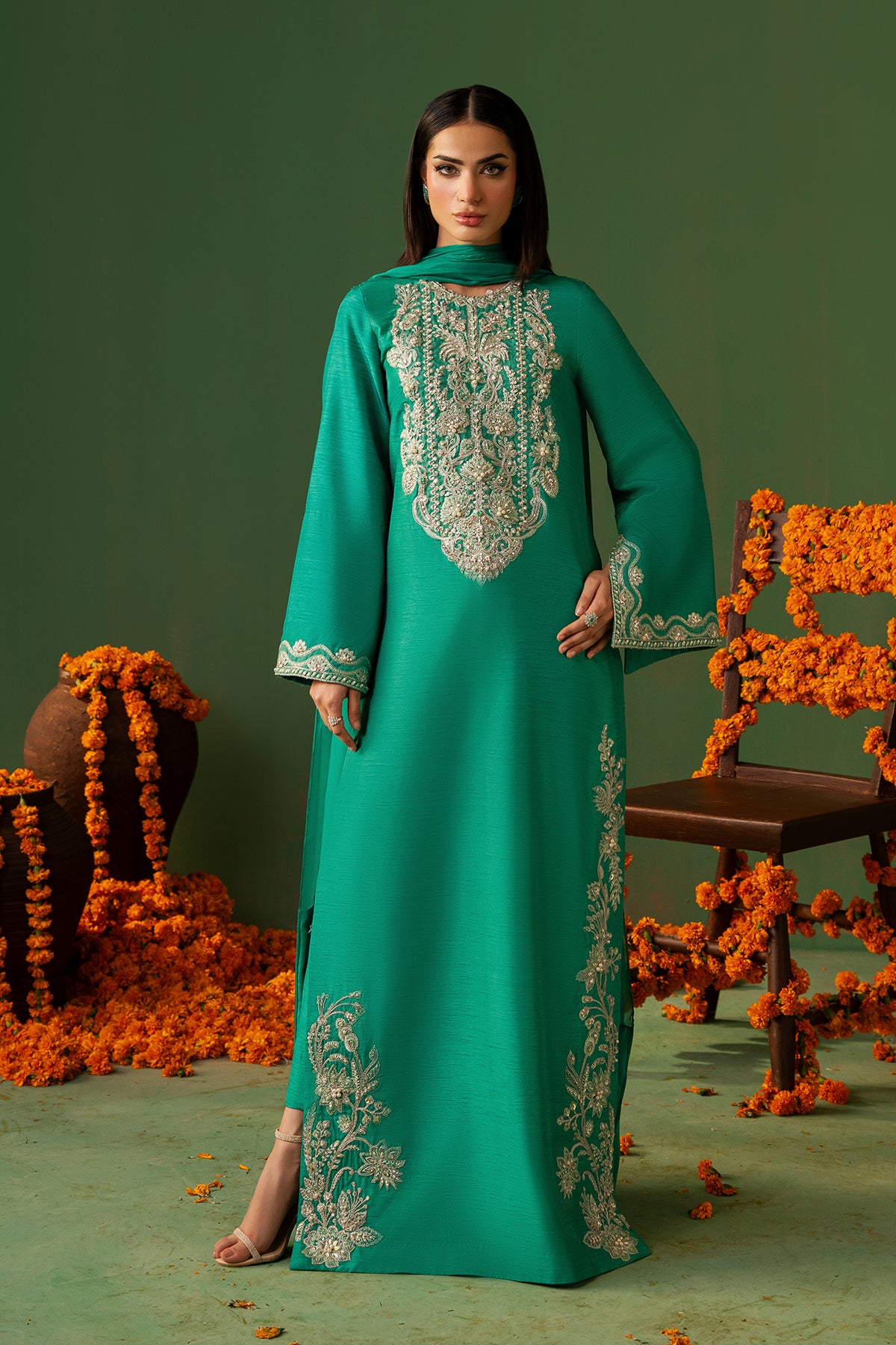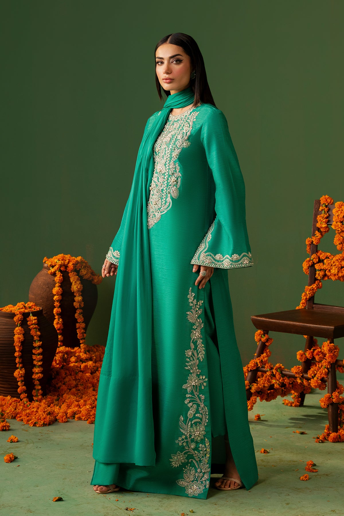 This fresh green Korean Raw Silk shirt, paired with straight capri pants and a Medium-Silk dupatta, features full sleeves adorned with intricate hand embroidery and embellishments on the sleeves and neckline. Making it an elegant choice for any special occasion.