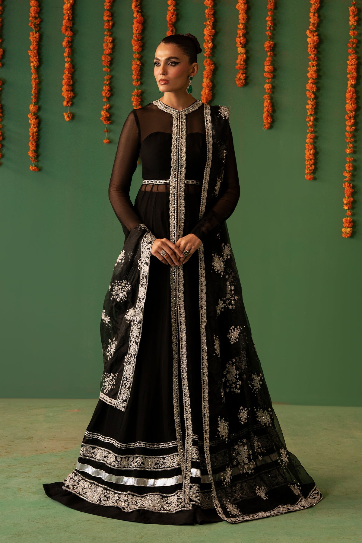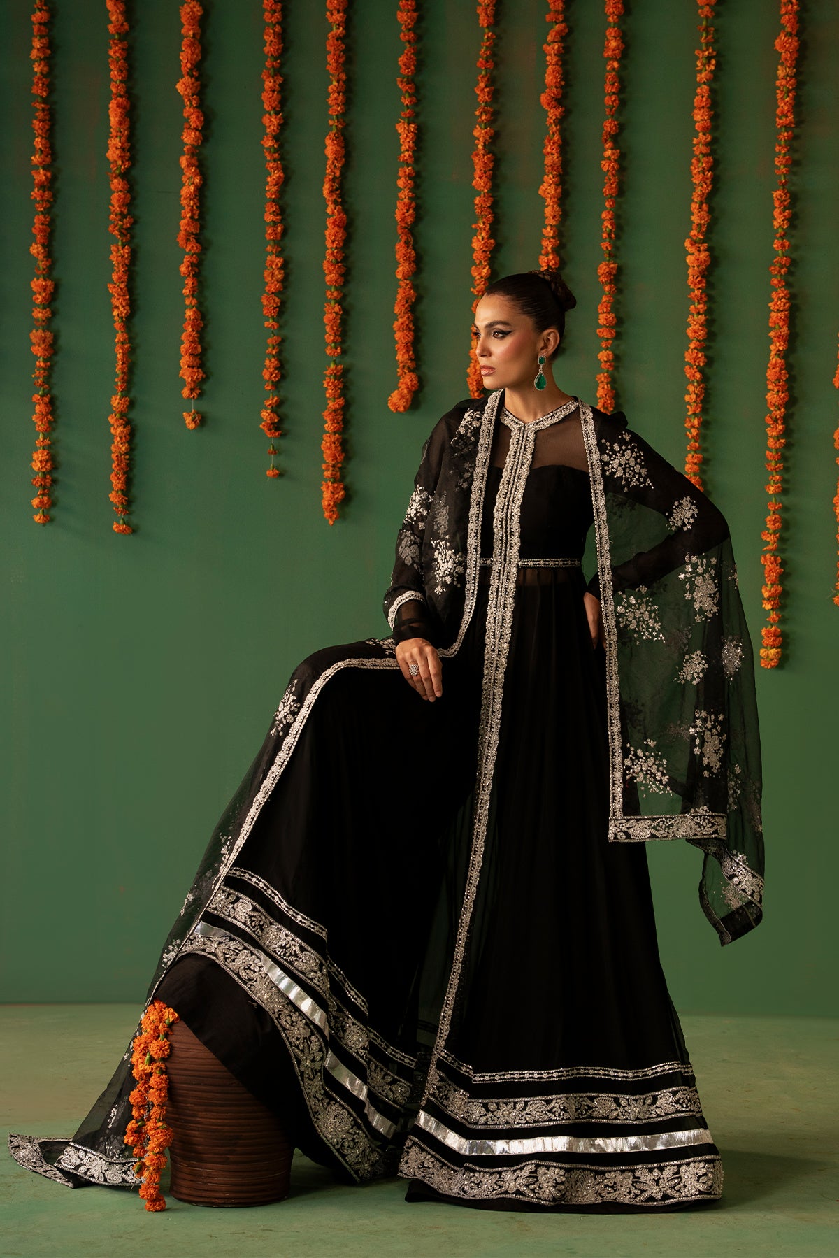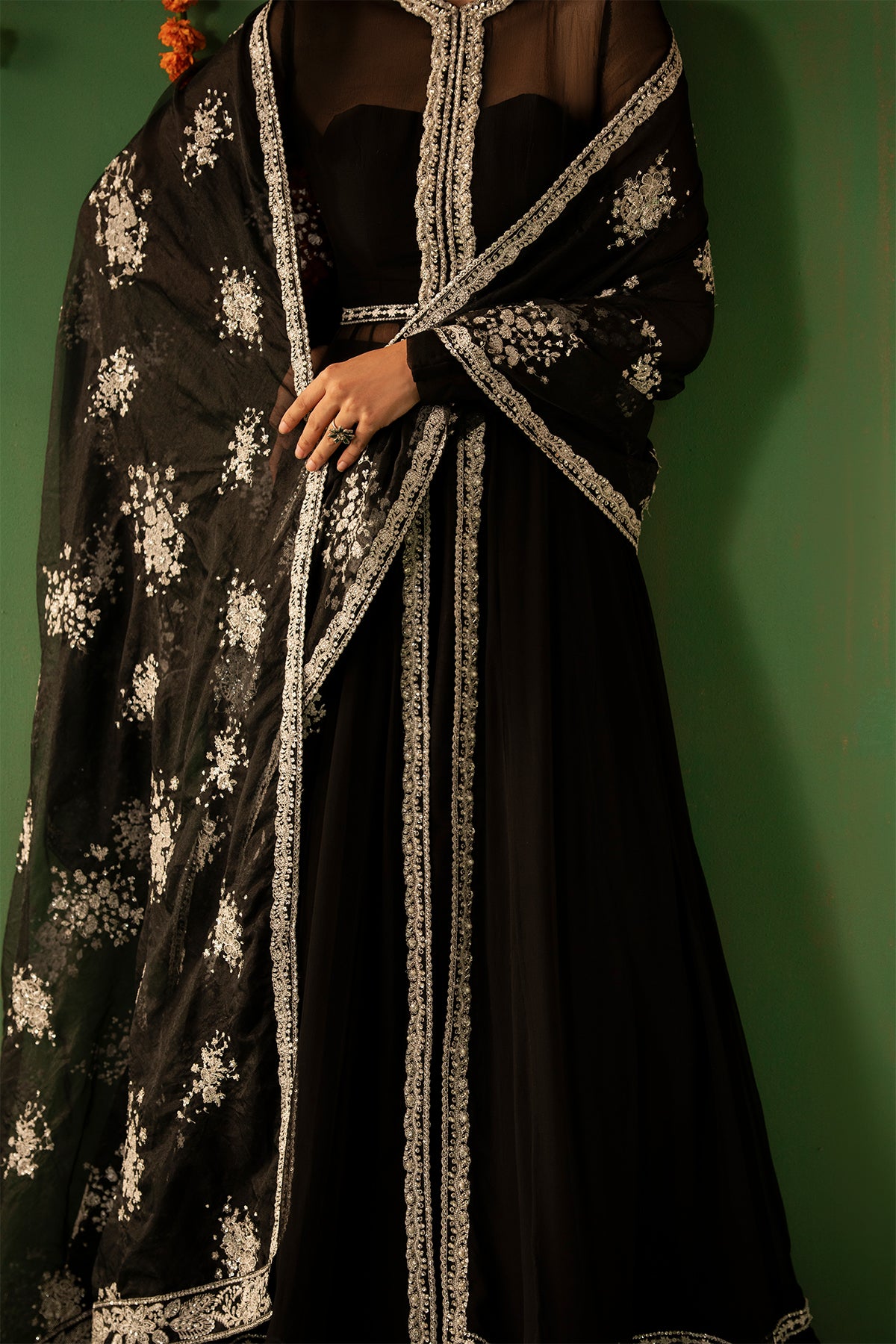 A timeless black Crinkle Chiffon pishwas featuring intricate embroidery, delicate hand embellishments, and lappa detailing. This full-length, front-open silhouette is paired with flared Raw Silk sharara pants and an Organza dupatta, beautifully detailed with embroidery and hand embellishments along all four borders, creating an outfit of classic elegance.