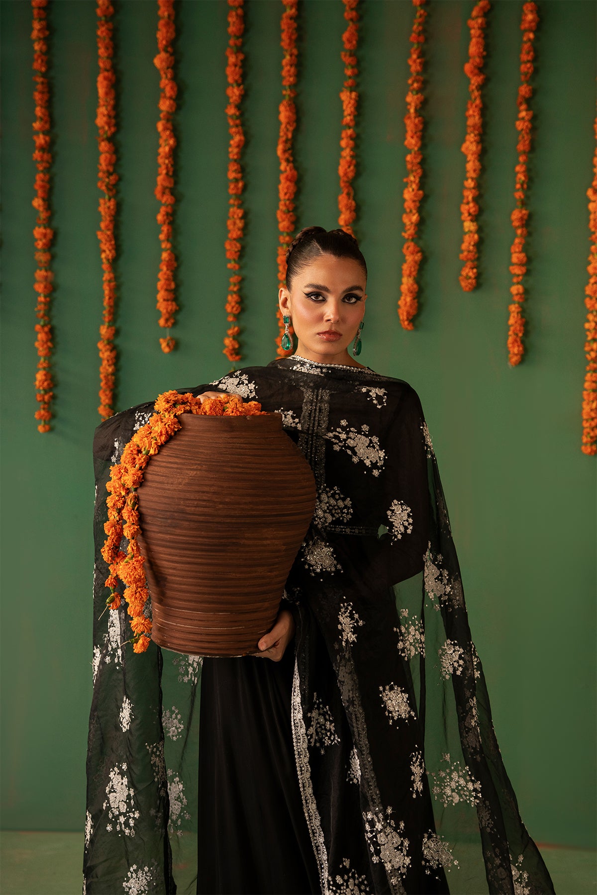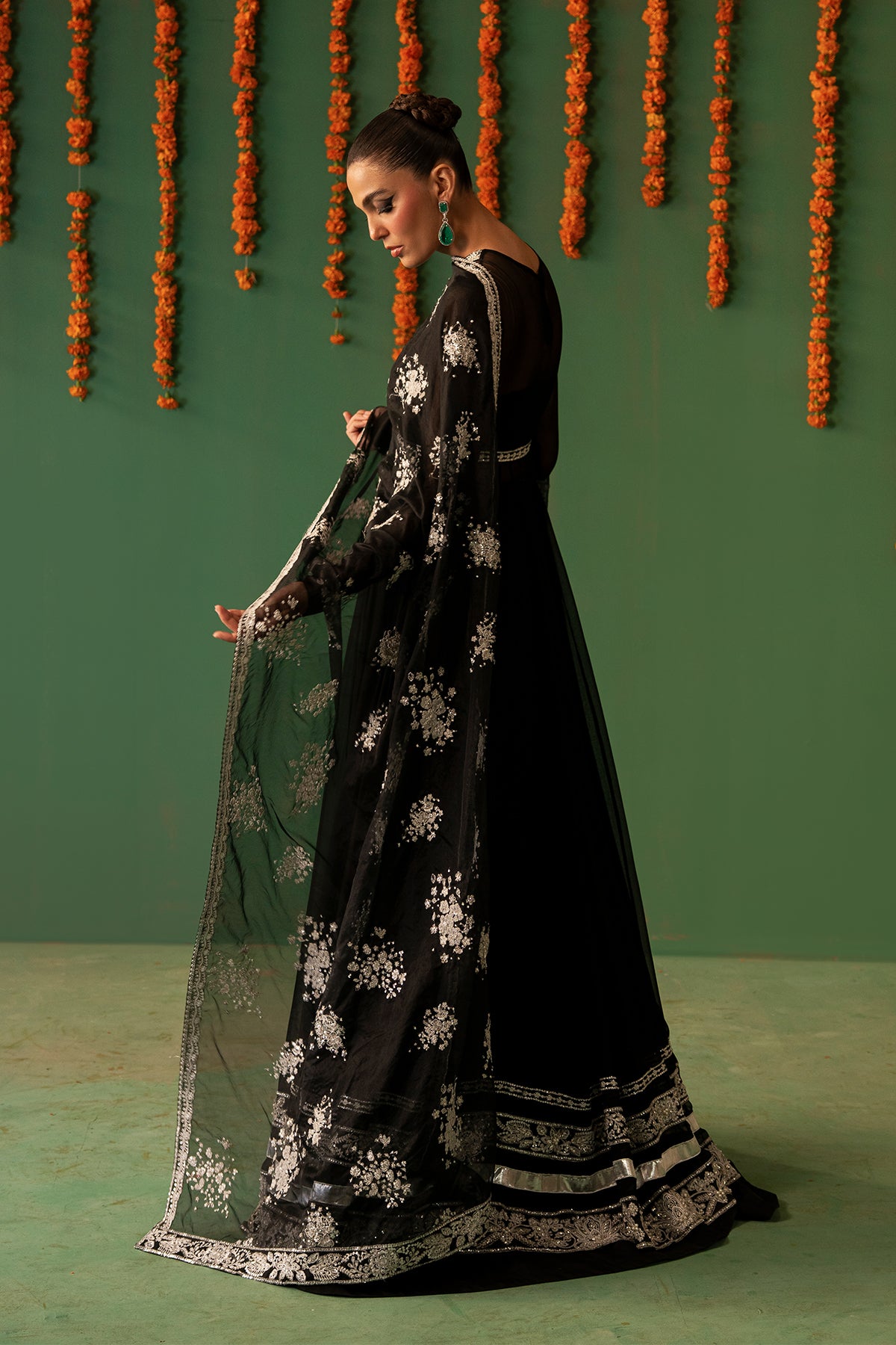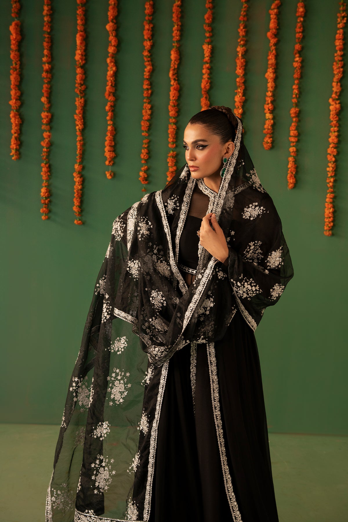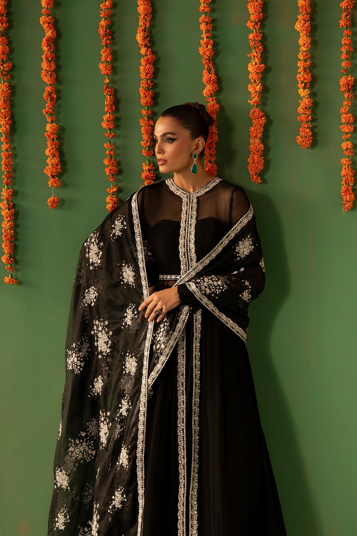 A timeless black Crinkle Chiffon pishwas featuring intricate embroidery, delicate hand embellishments, and lappa detailing. This full-length, front-open silhouette is paired with flared Raw Silk sharara pants and an Organza dupatta, beautifully detailed with embroidery and hand embellishments along all four borders, creating an outfit of classic elegance.